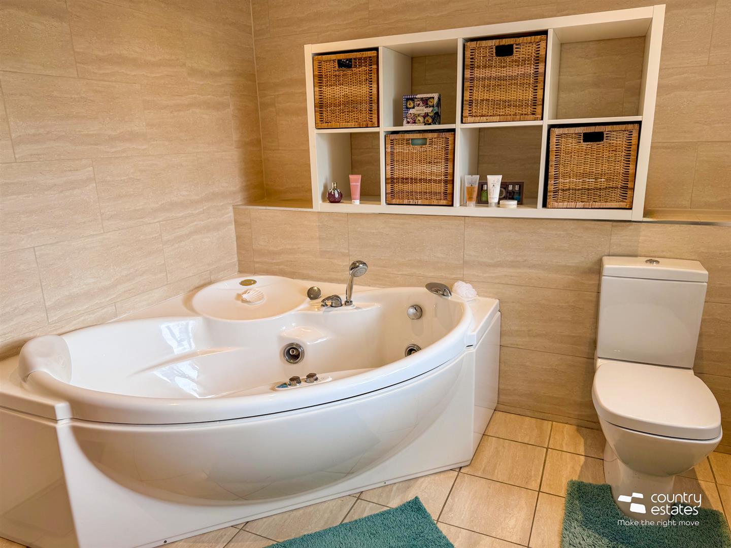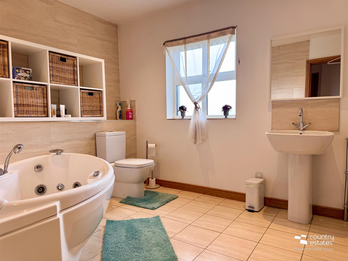 Comprising pedestal wash hand basin with monobloc tap, button flush w.c, large Jacuzzi bath with retractable hand shower attachment. Feature tiled accent walls. Tiled floor.