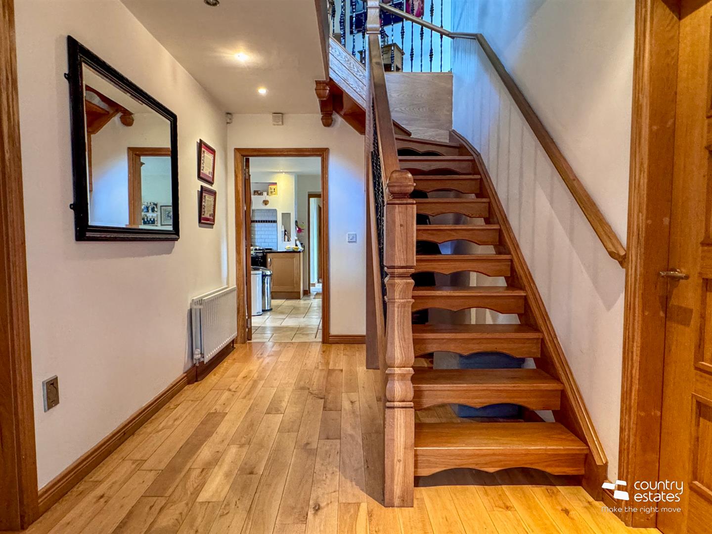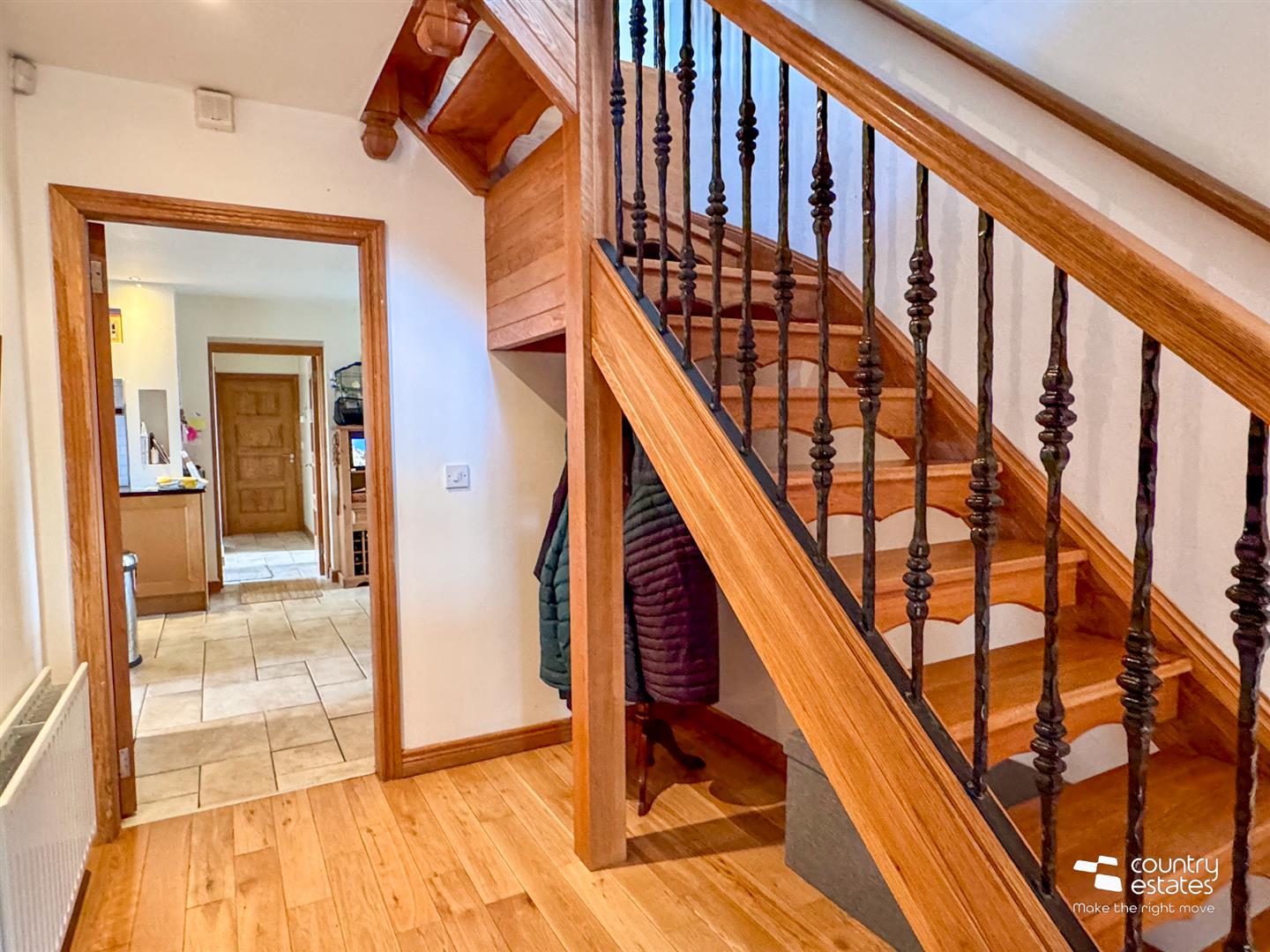 Feature open tread oak staircase with wrought iron balustrading.