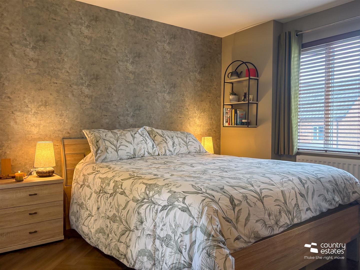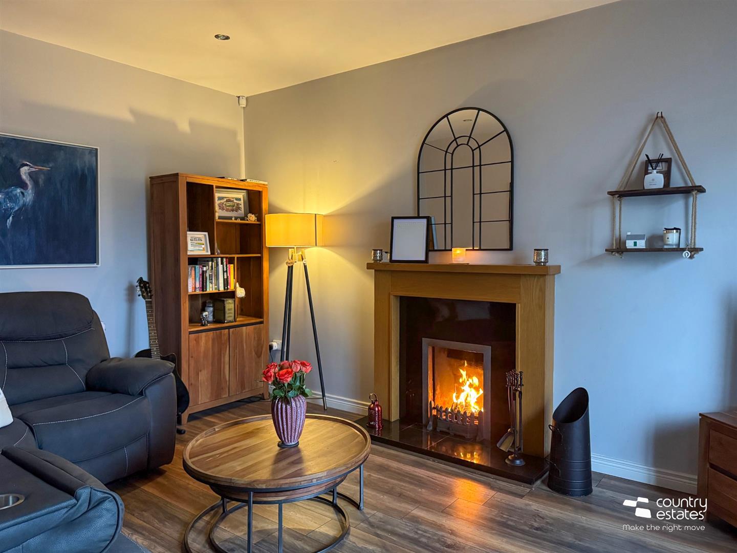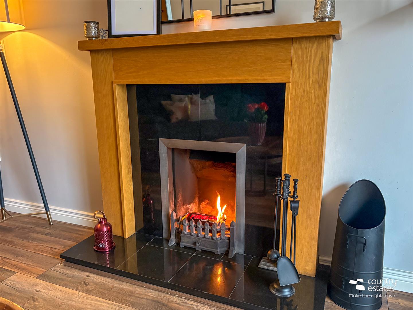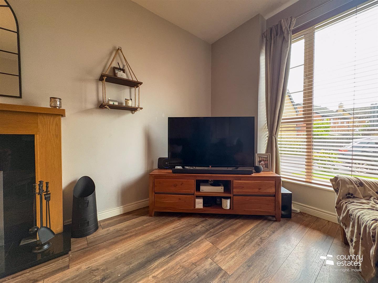 Attractive modern fireplace with polished granite inset and hearth. Quality laminate flooring.
