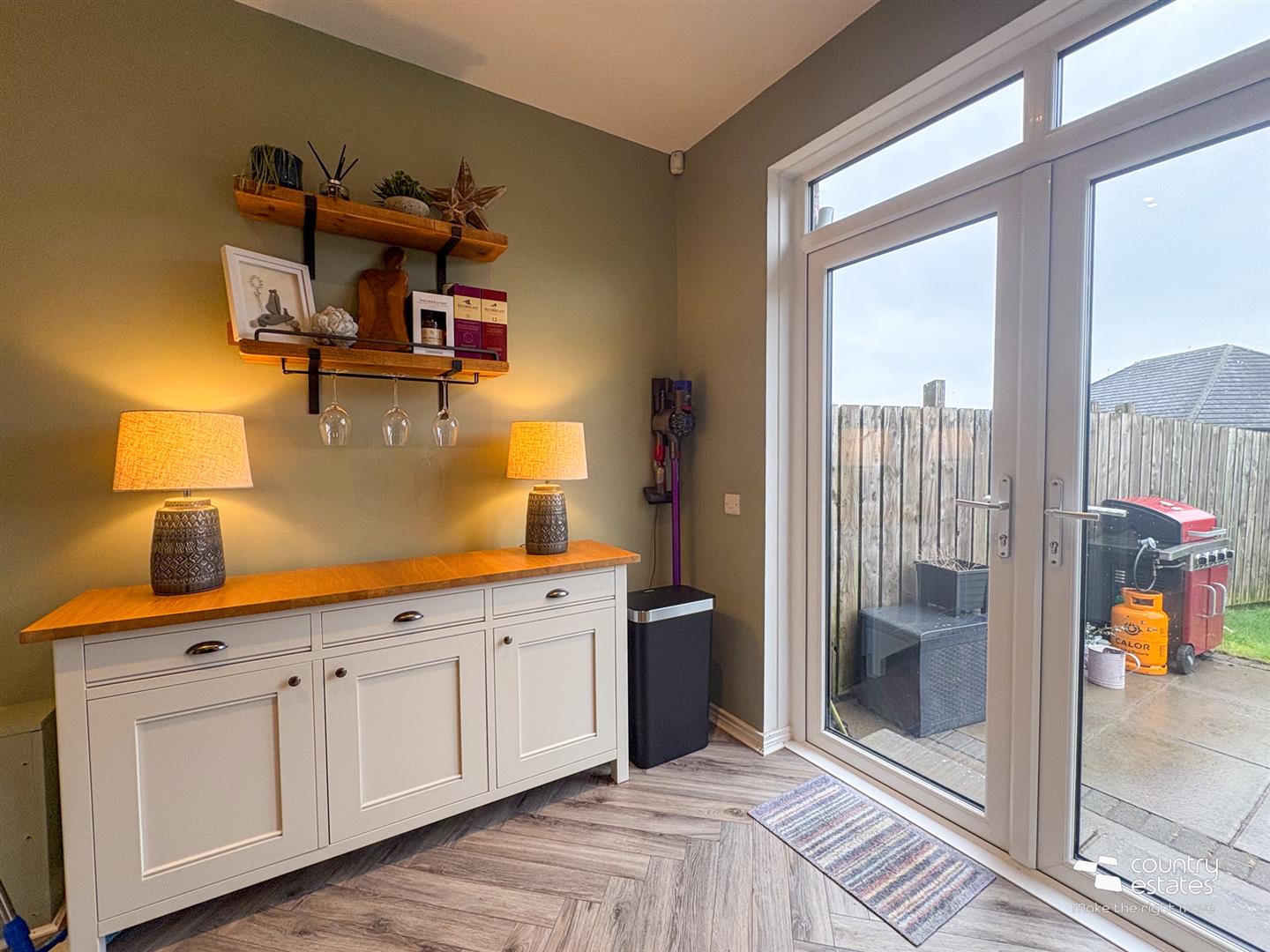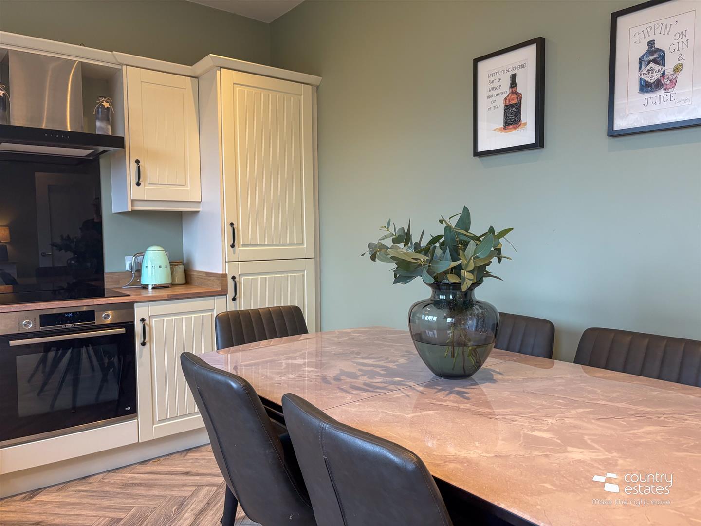 Herringbone laminate flooring extending through to kitchen/ dining.