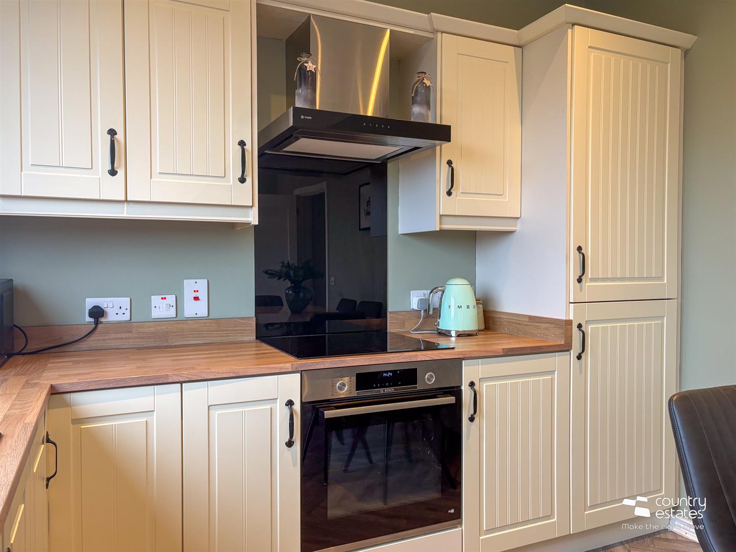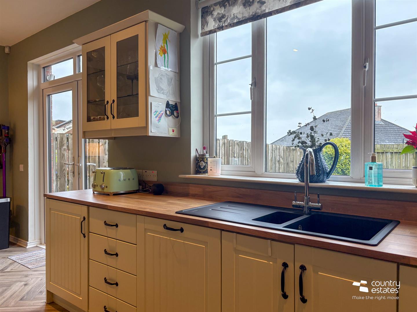 Equipped with a comprehensive range of high and low level fitted units in cream finish with new installed contrasting work surfaces. Inlaid Single drainer black quartz sink unit. A range of integrated appliances including newly installed oven with separate 4 ring hob, overhead extractor fan housed in stainless steel canopy, fridge freezer and dishwasher. Plumbed for washing machine. Herringbone laminate flooring. Part tiled walls. Twin composite double glazed doors to patio and garden.