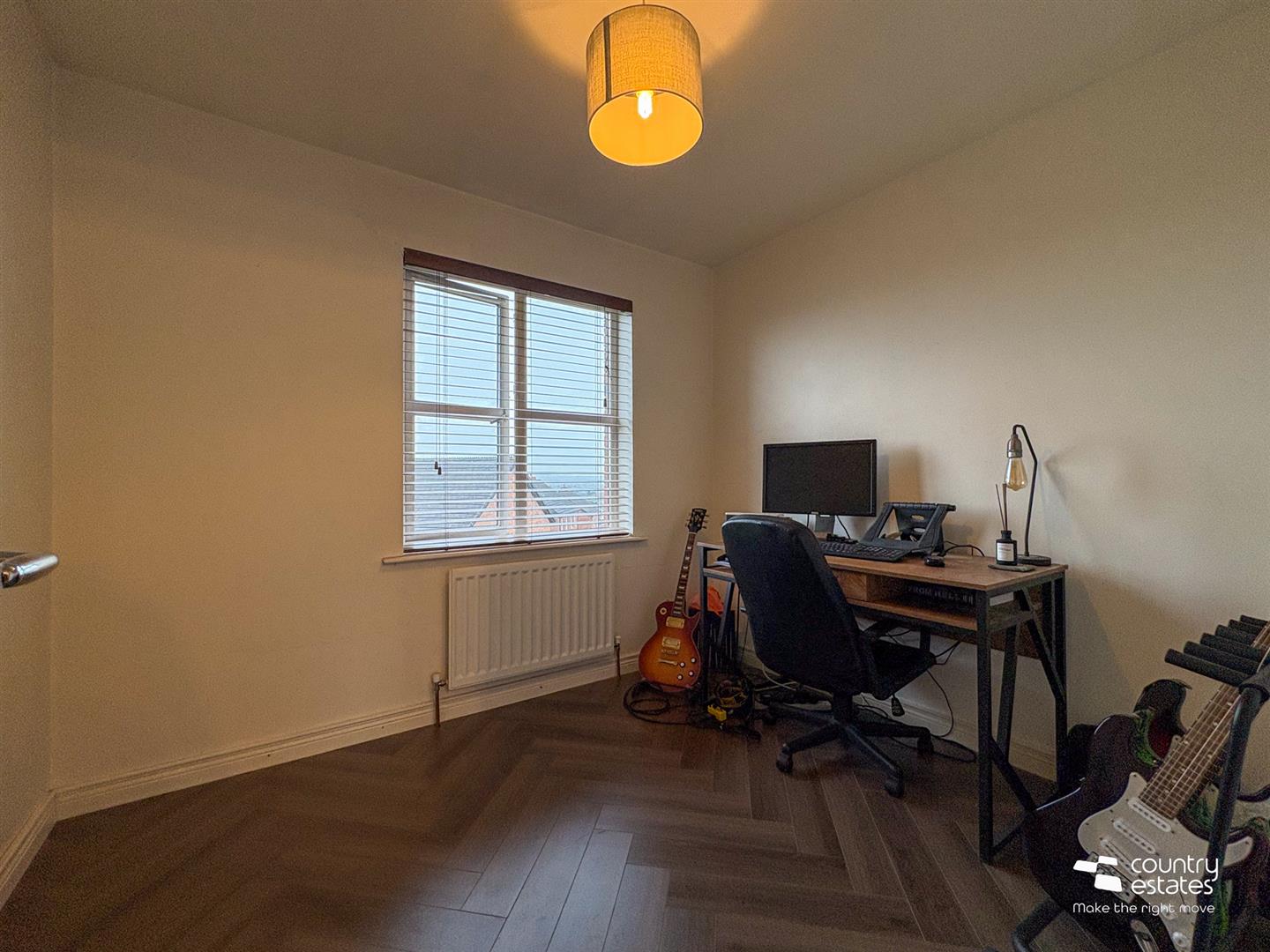 Newly installed Herringbone laminate flooring. Storage cupboard.