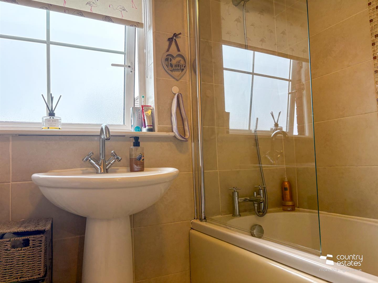 Comprising button flush w.c, panelled bath with fixed shower screen and shower attachment and floating gloss vanity unit with monobloc tap. Tiled floor. Part tiled walls.