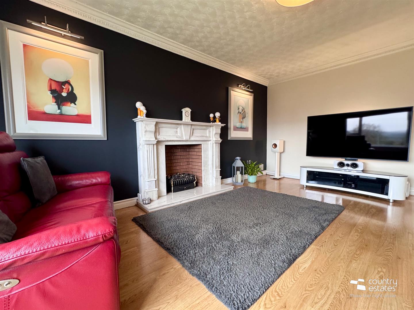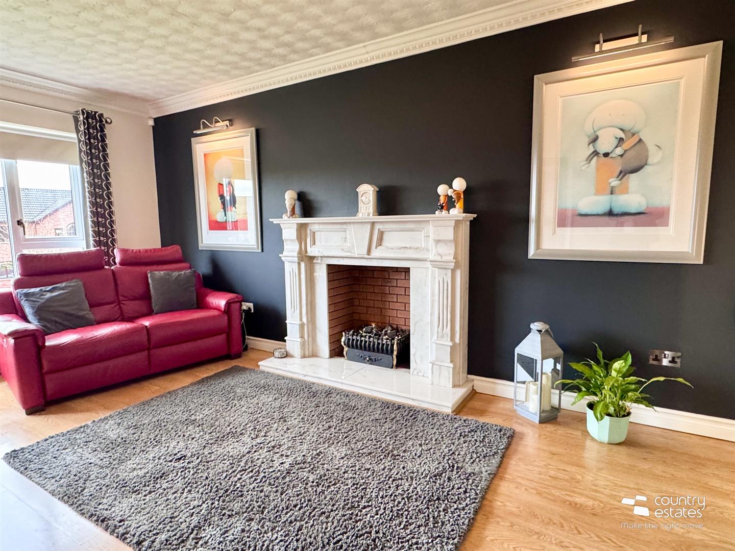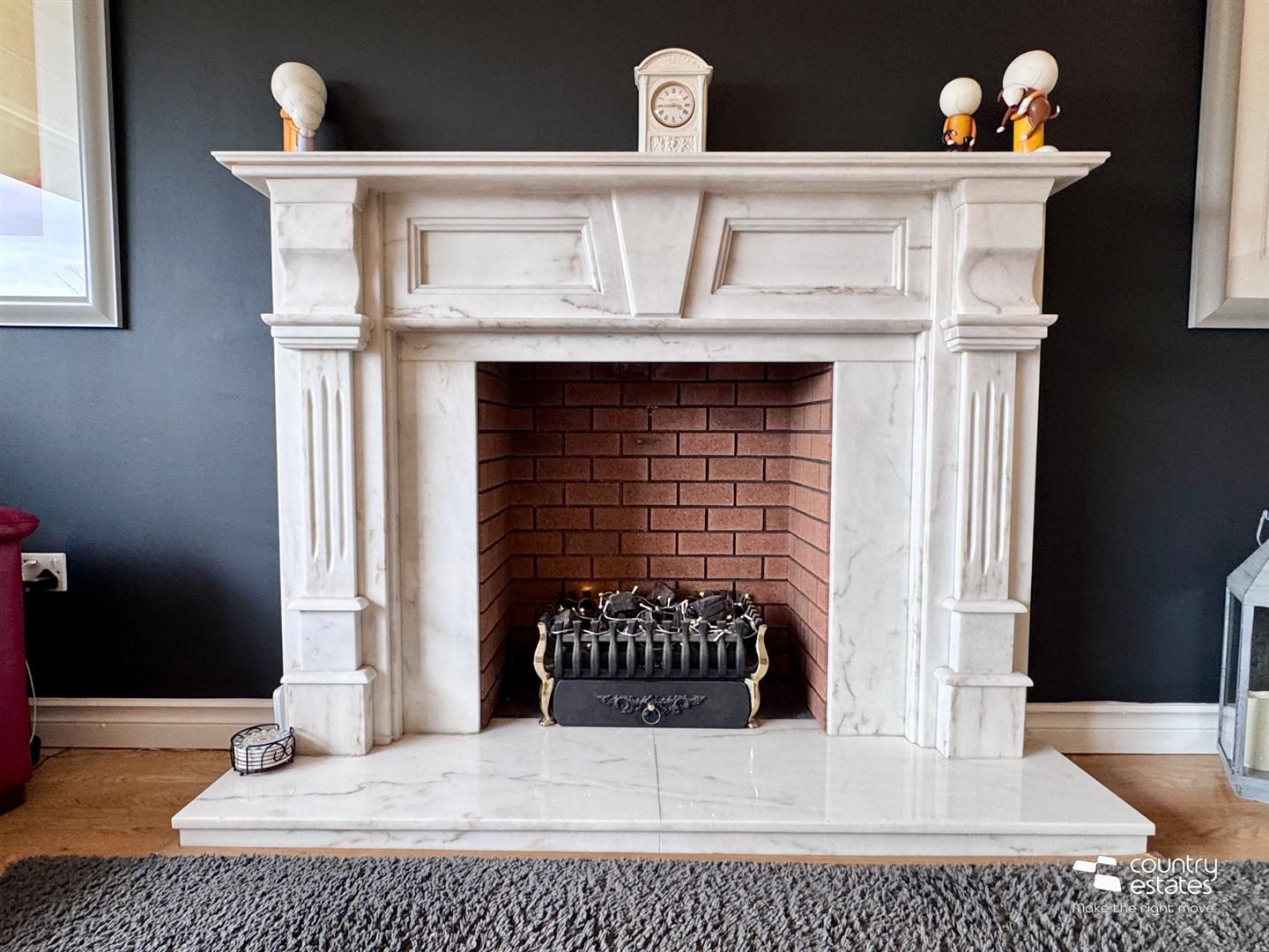 Attractive Italian marble fireplace with matching hearth and gas fire inset. Corniced ceiling. Picture style window with views over cul de sac extending towards surrounding countryside.