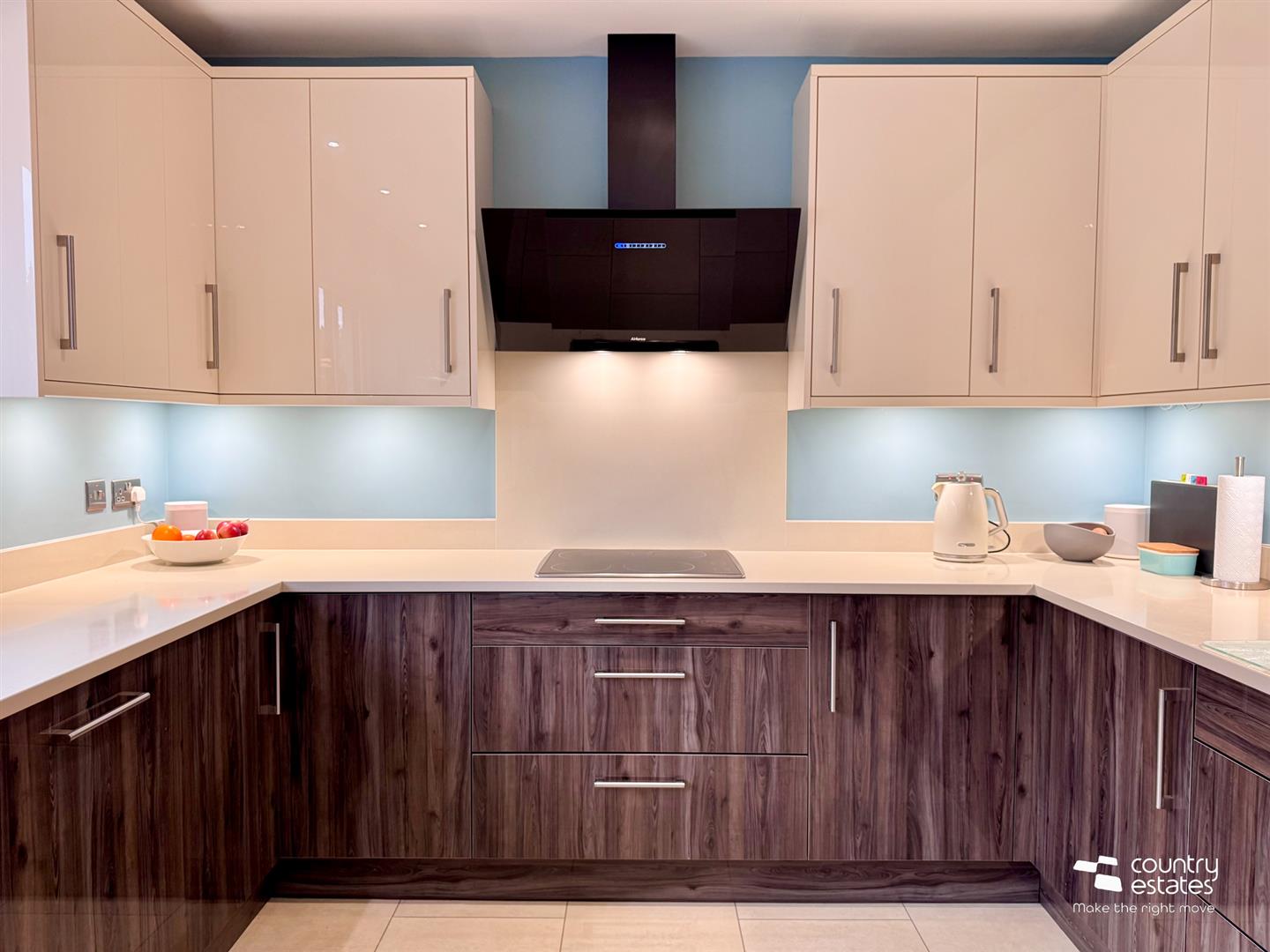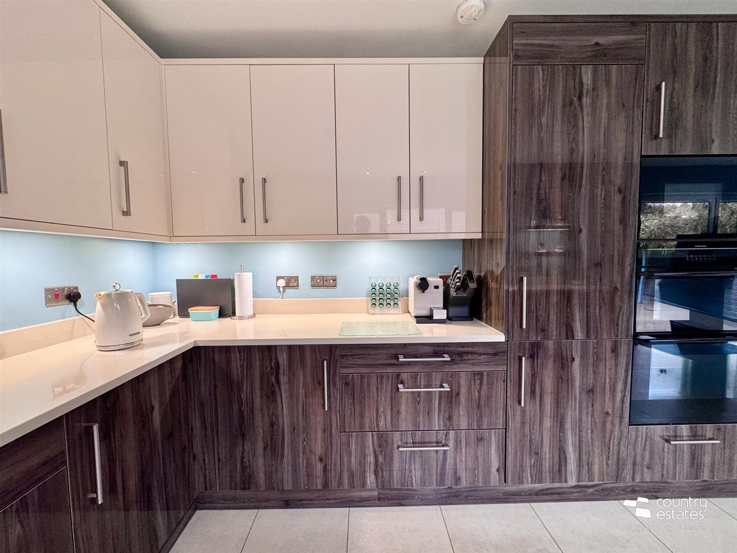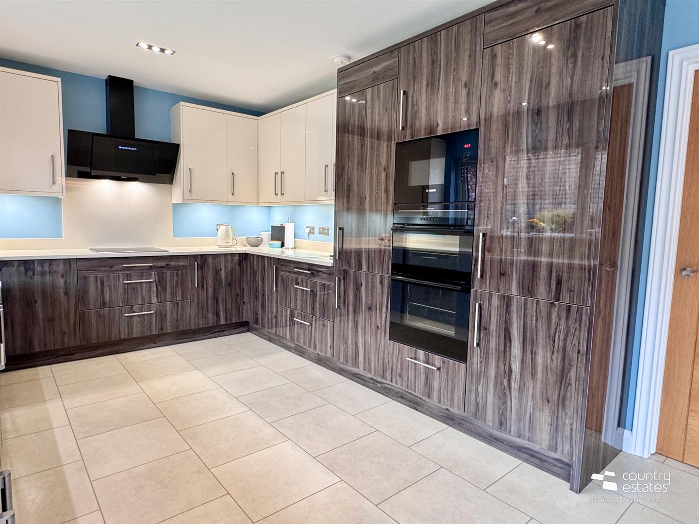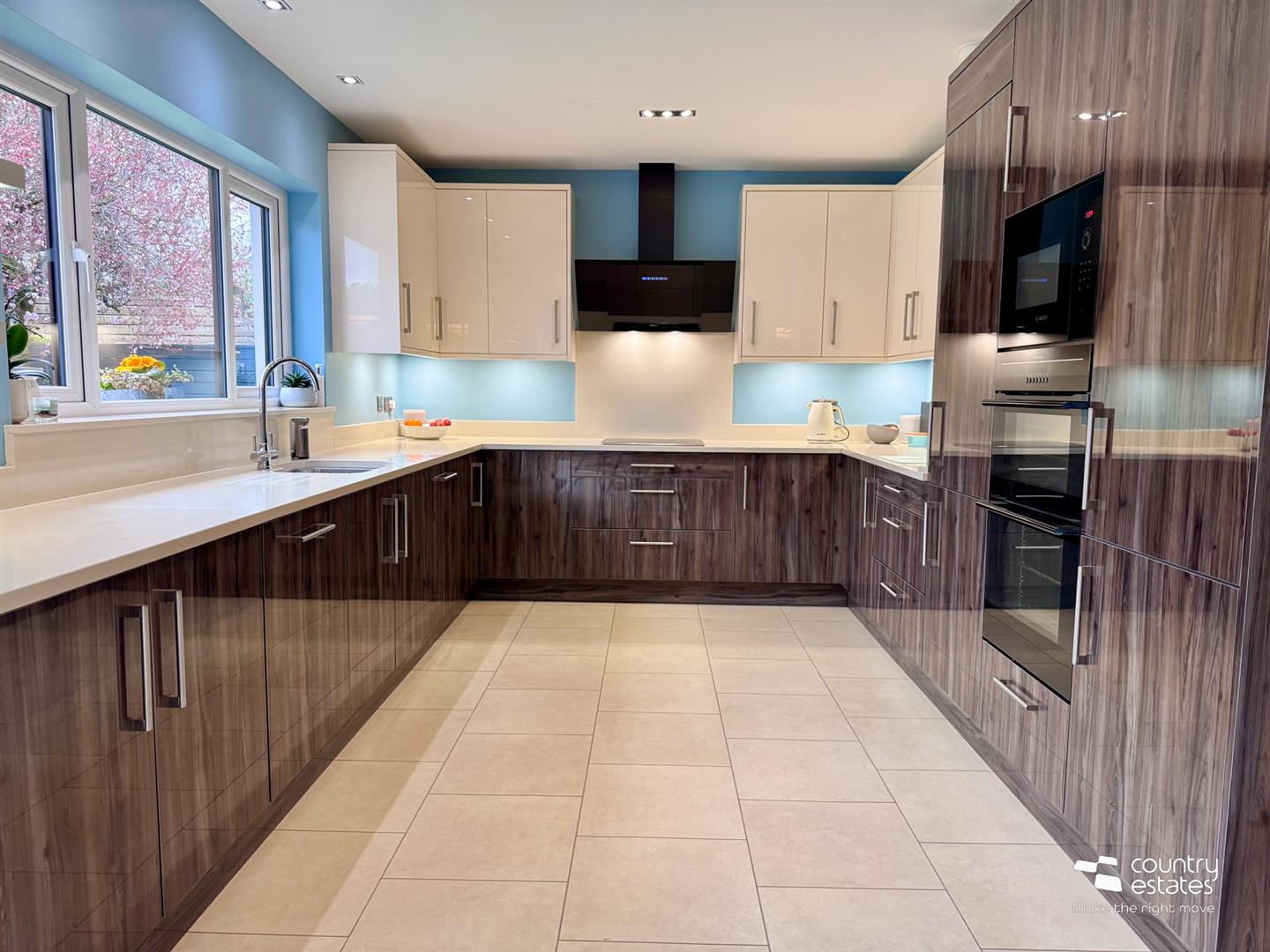 At max. Comprising luxury modern kitchen fitted with a comprehensive range of high and low level fitted units in contrasting gloss finishes and co-ordinating quality quartzite work surfaces and upstands. Inlaid stainless steel sink with swan neck mixer tap. A host of integrated appliances including eye level Bosch microwave, double oven, separate 4 ring halogan hob with modern overhead angled 'Airforce' extractor fan, dishwasher and fridge freezer. 'Karndean' LTV flooring. Service door leading to internal staircase providing access to Integral double basement style garage and utility.