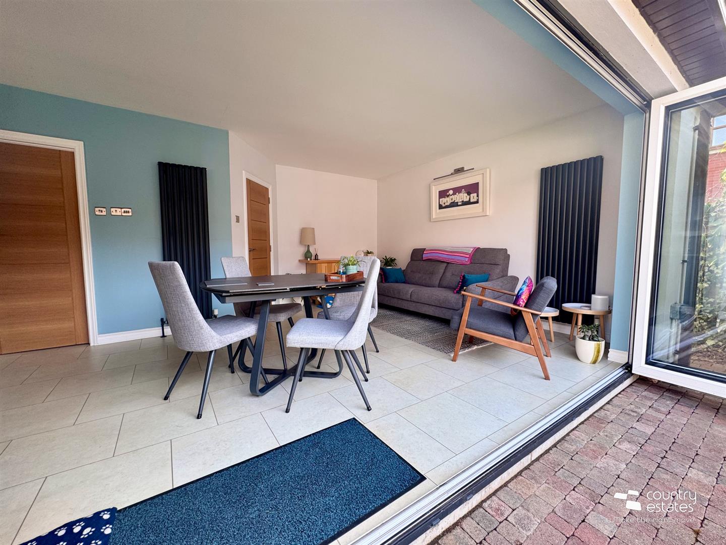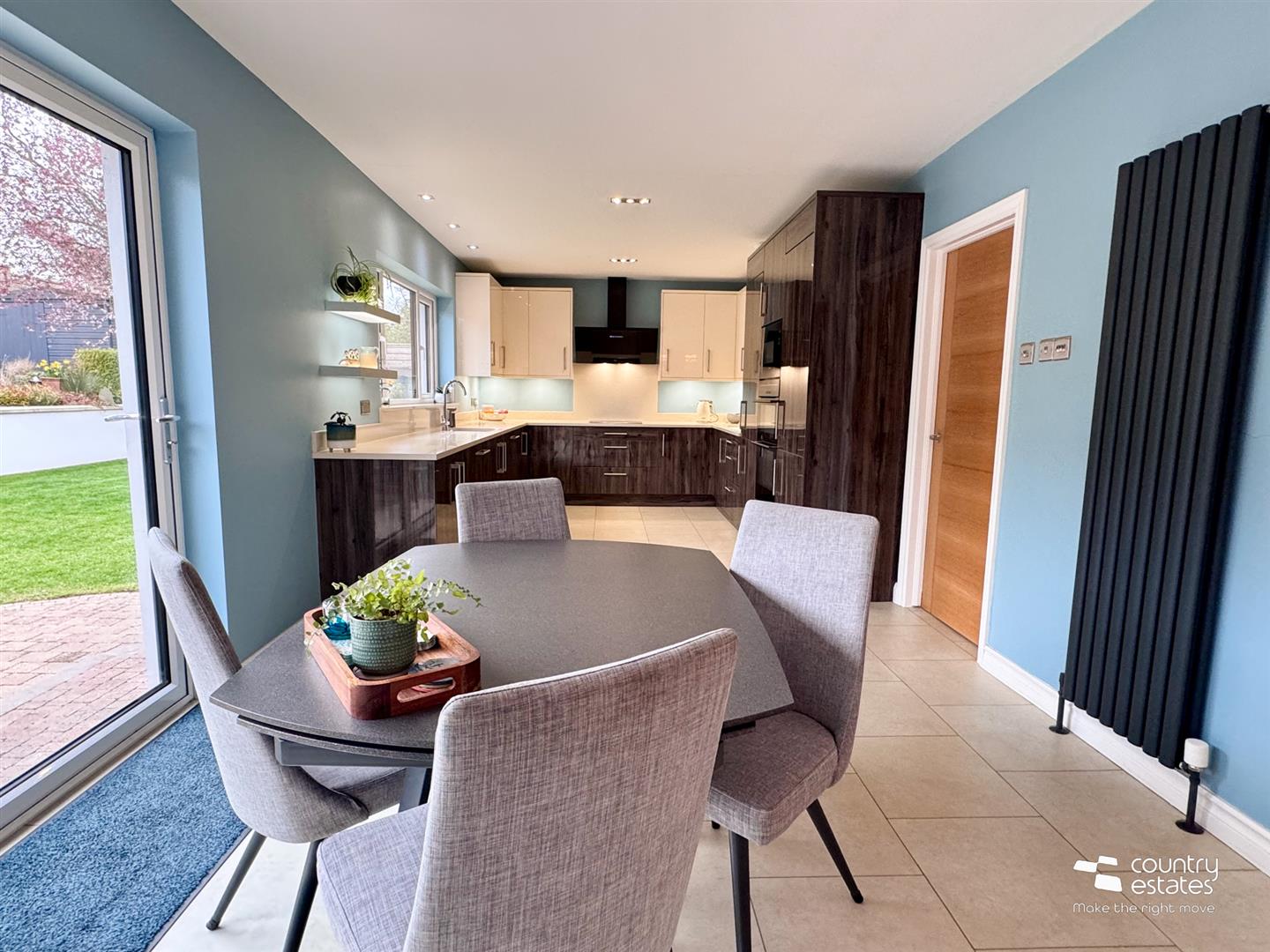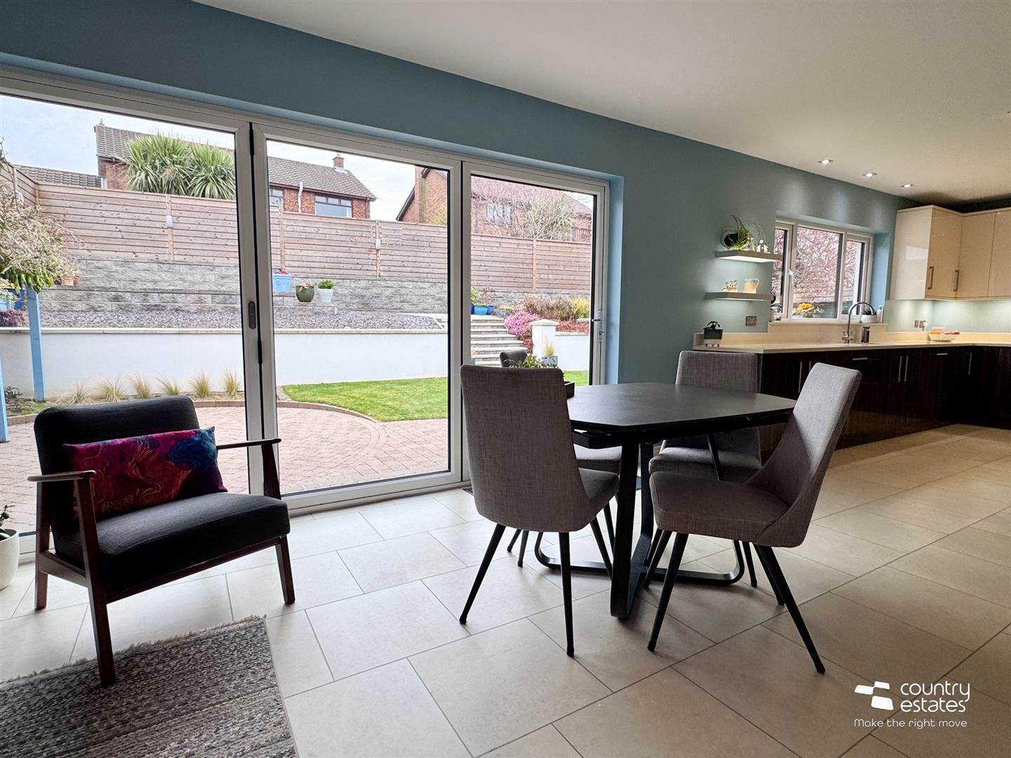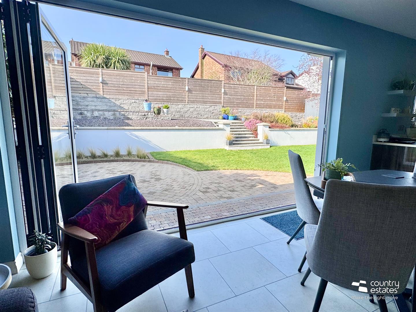 With full size bi-folding doors to landscaped gardens, patio and raised terrace.