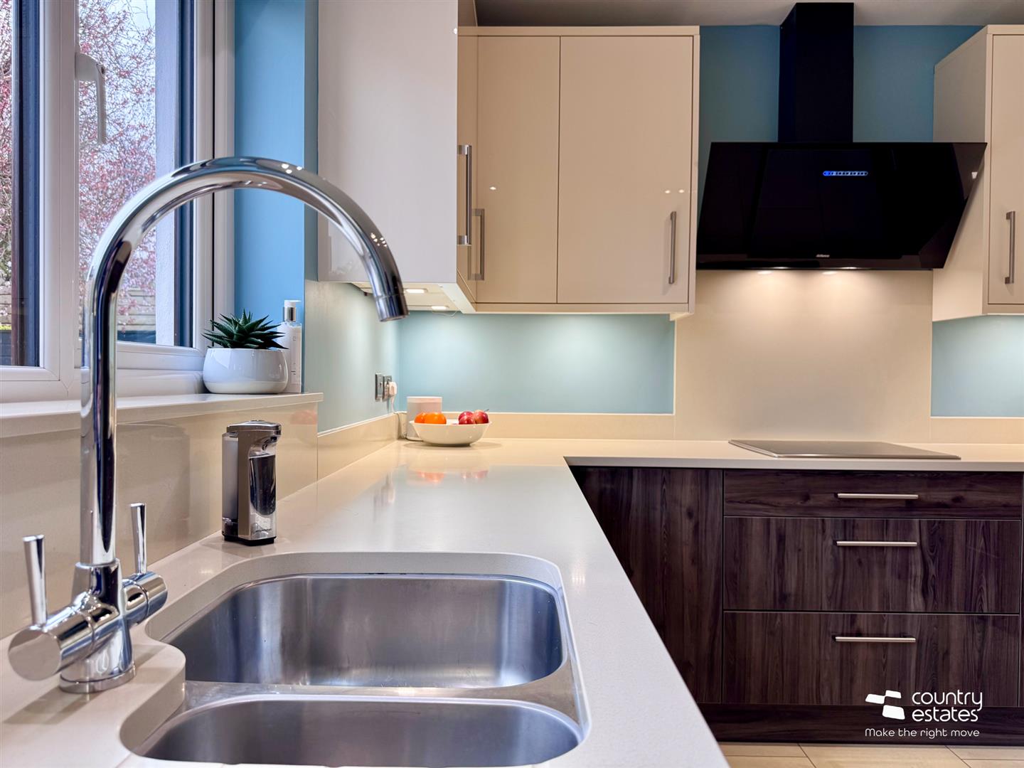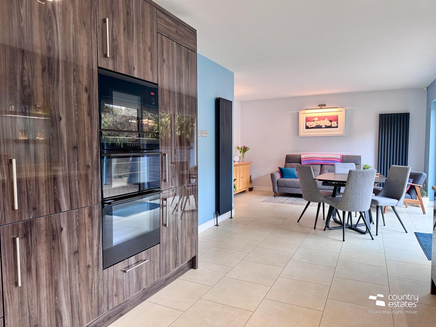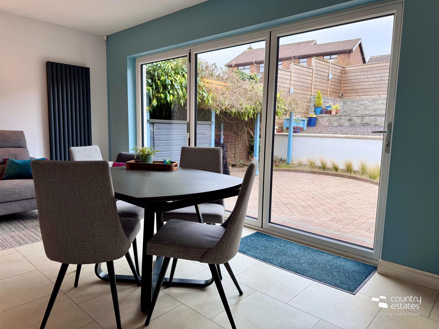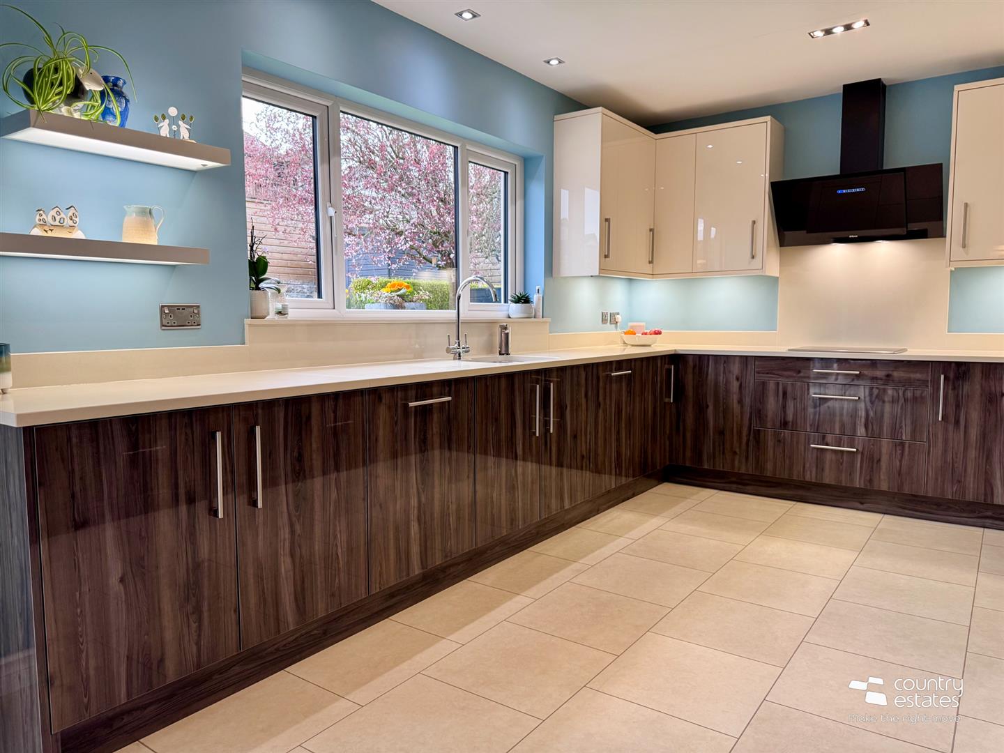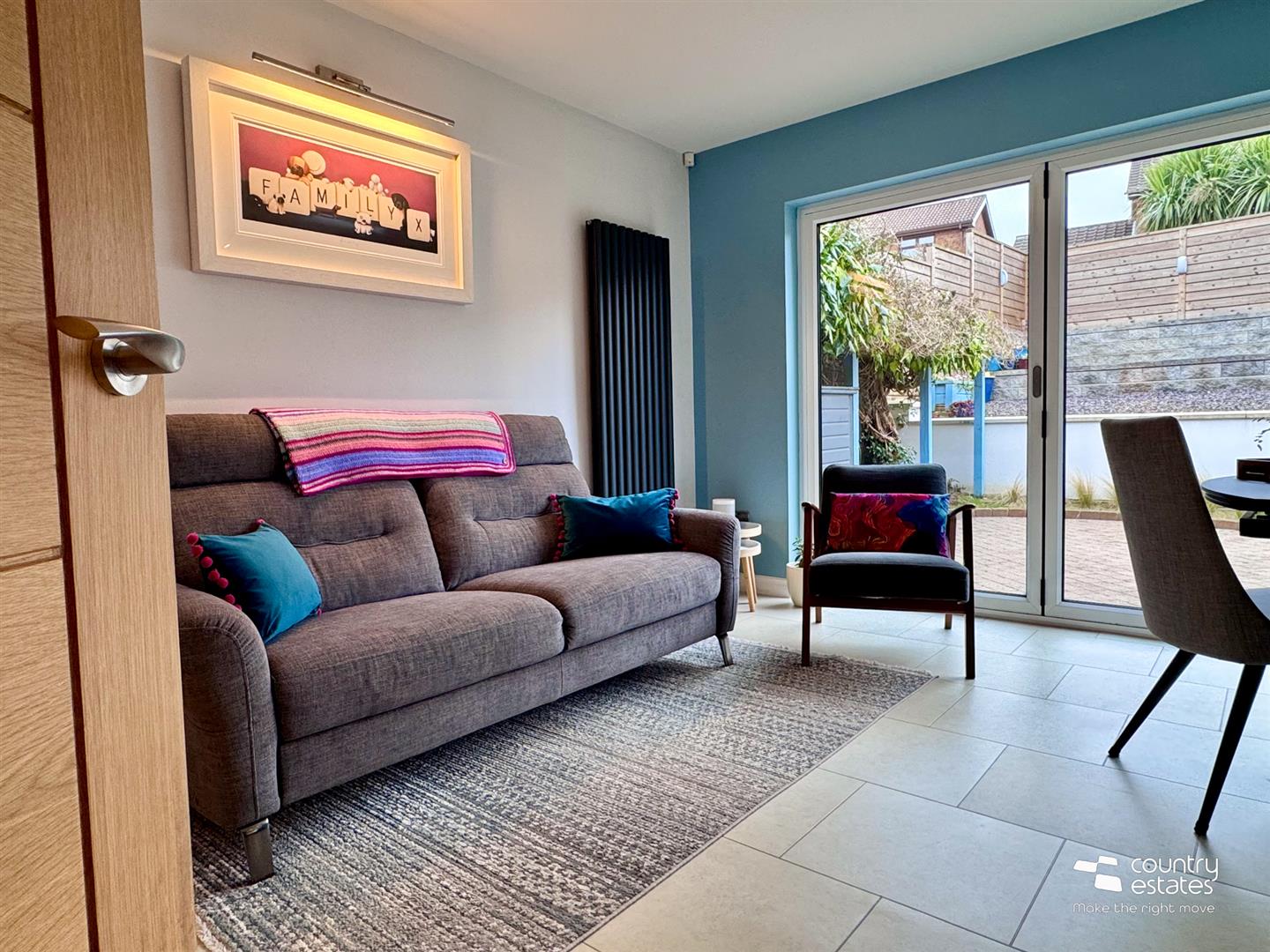 With full size bi-folding doors to landscaped gardens, patio and raised terrace.