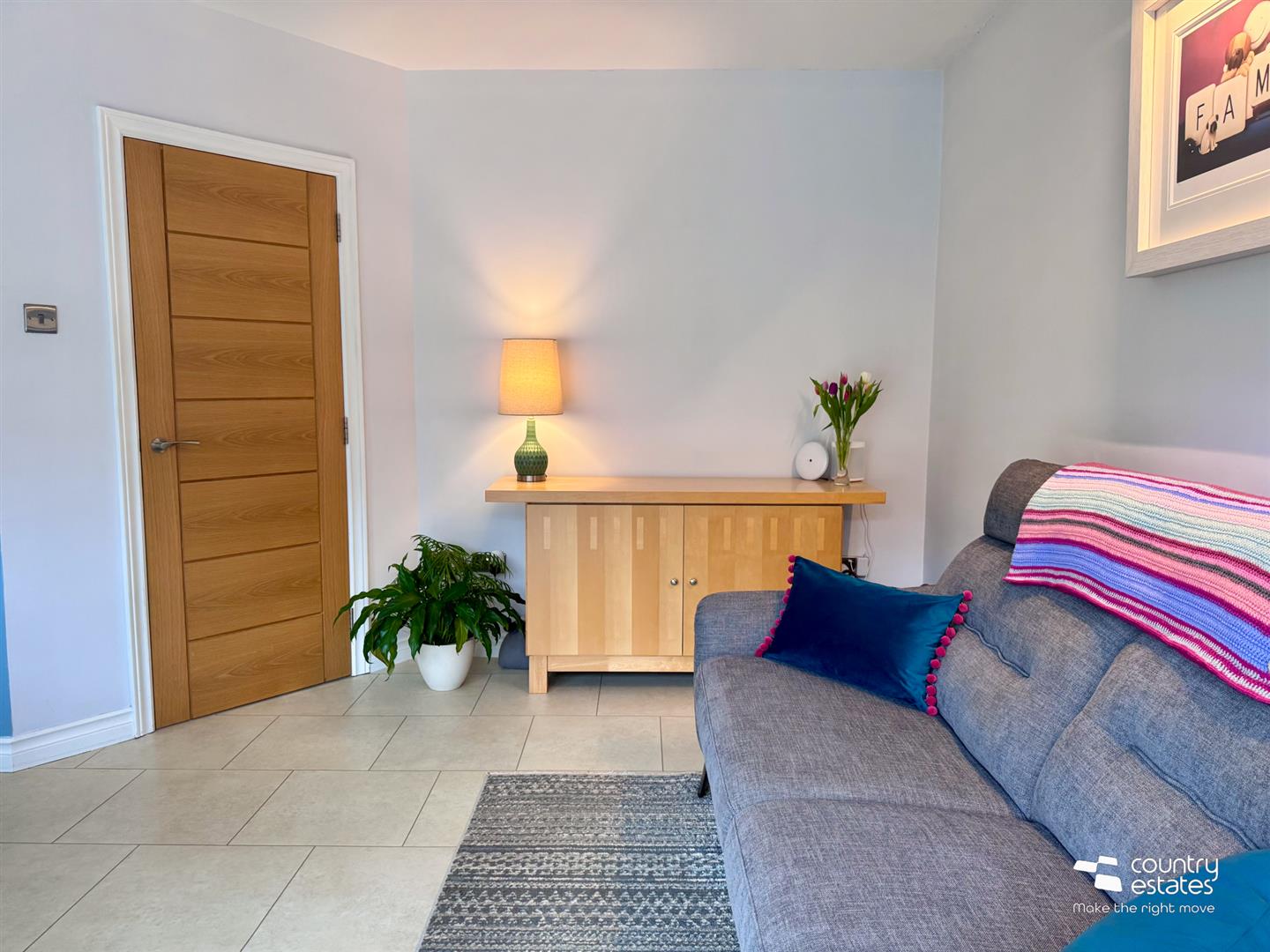 With composite front door with full height double glazed frosted side screen into:-
