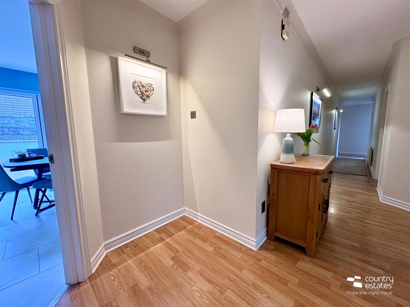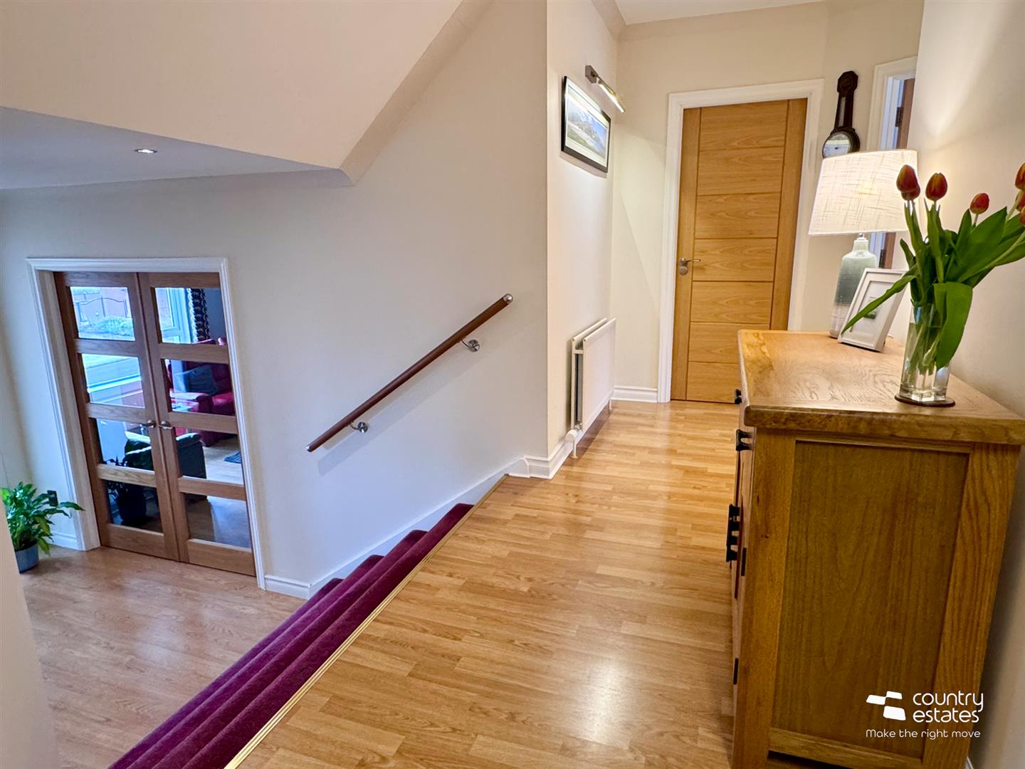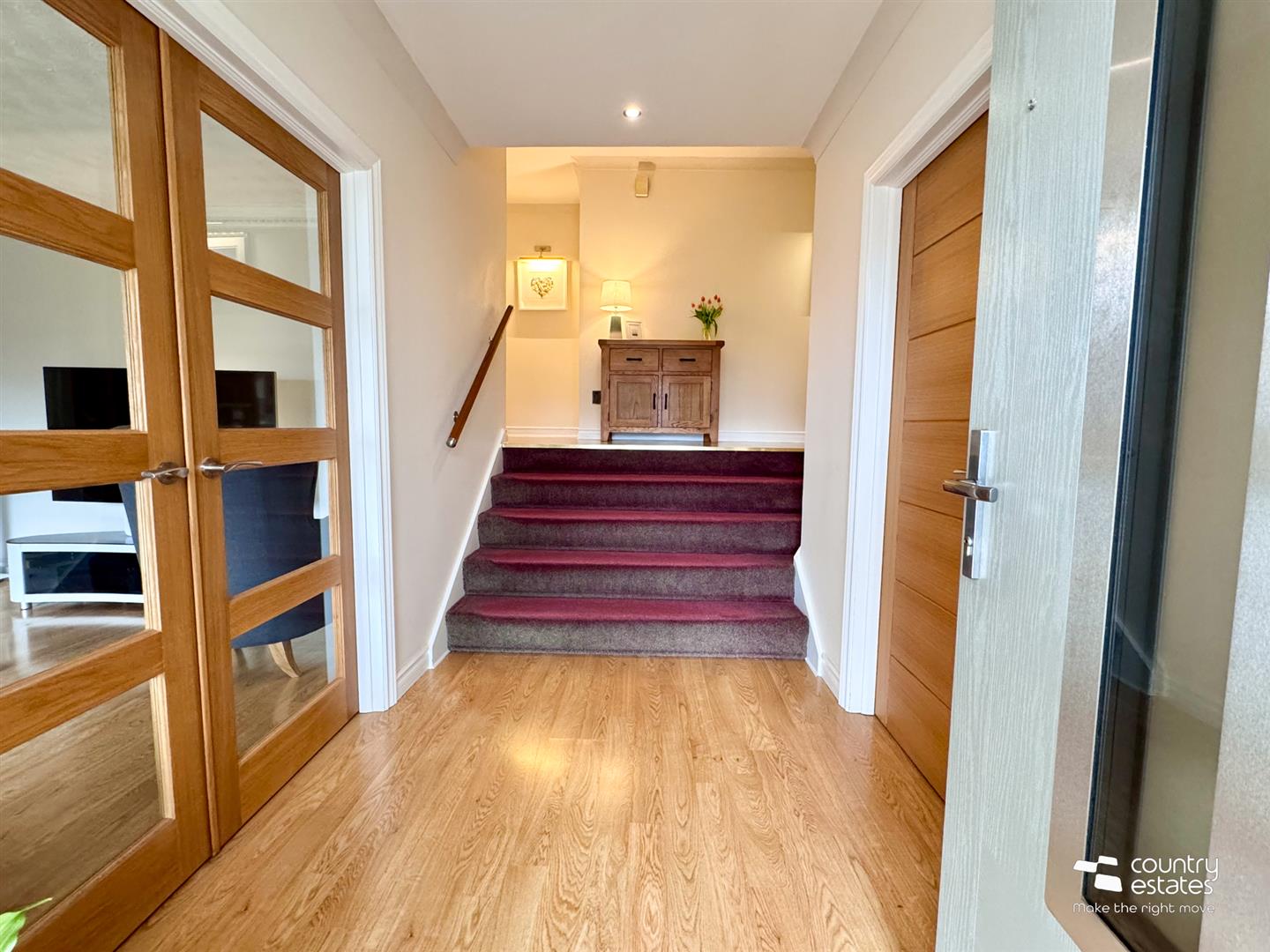 Quality oak effect laminate strip flooring extending through twin oak glazed doors into:-