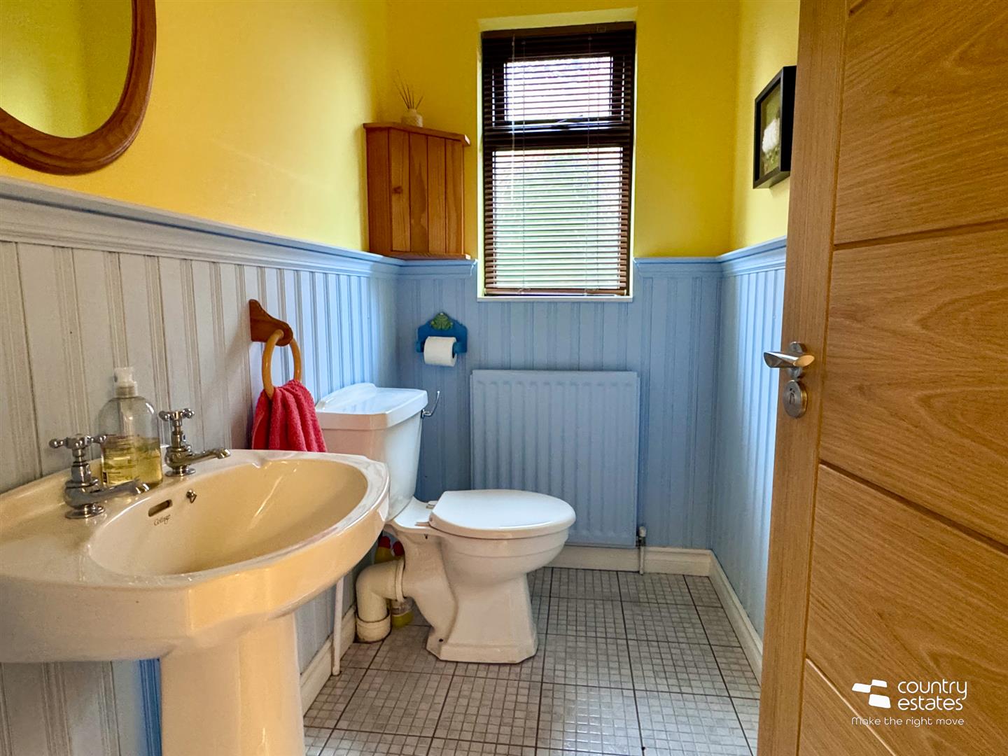 Comprising low flush w.c, pedestal wash hand basin. Part painted panelled walls. Tiled floor.