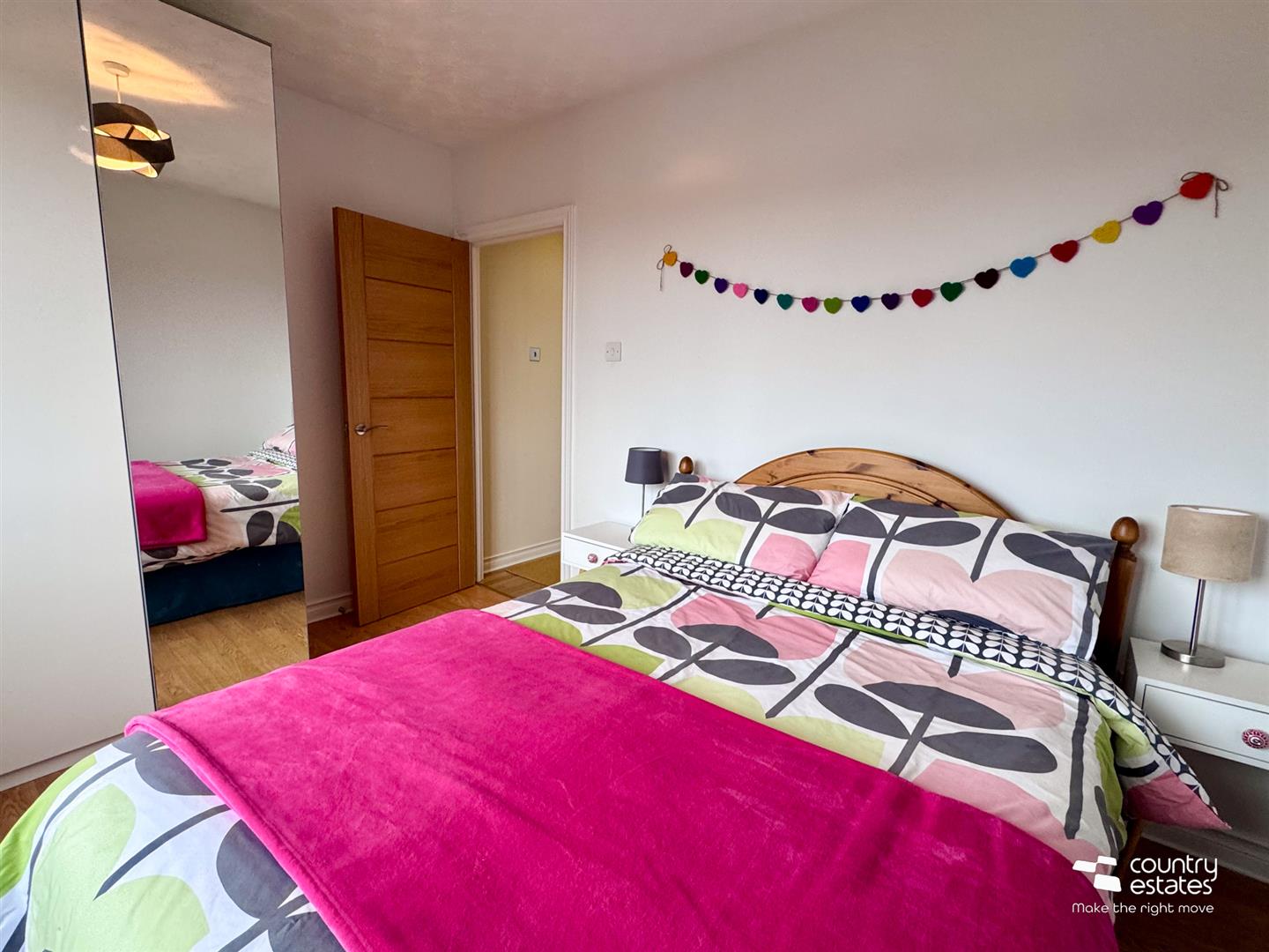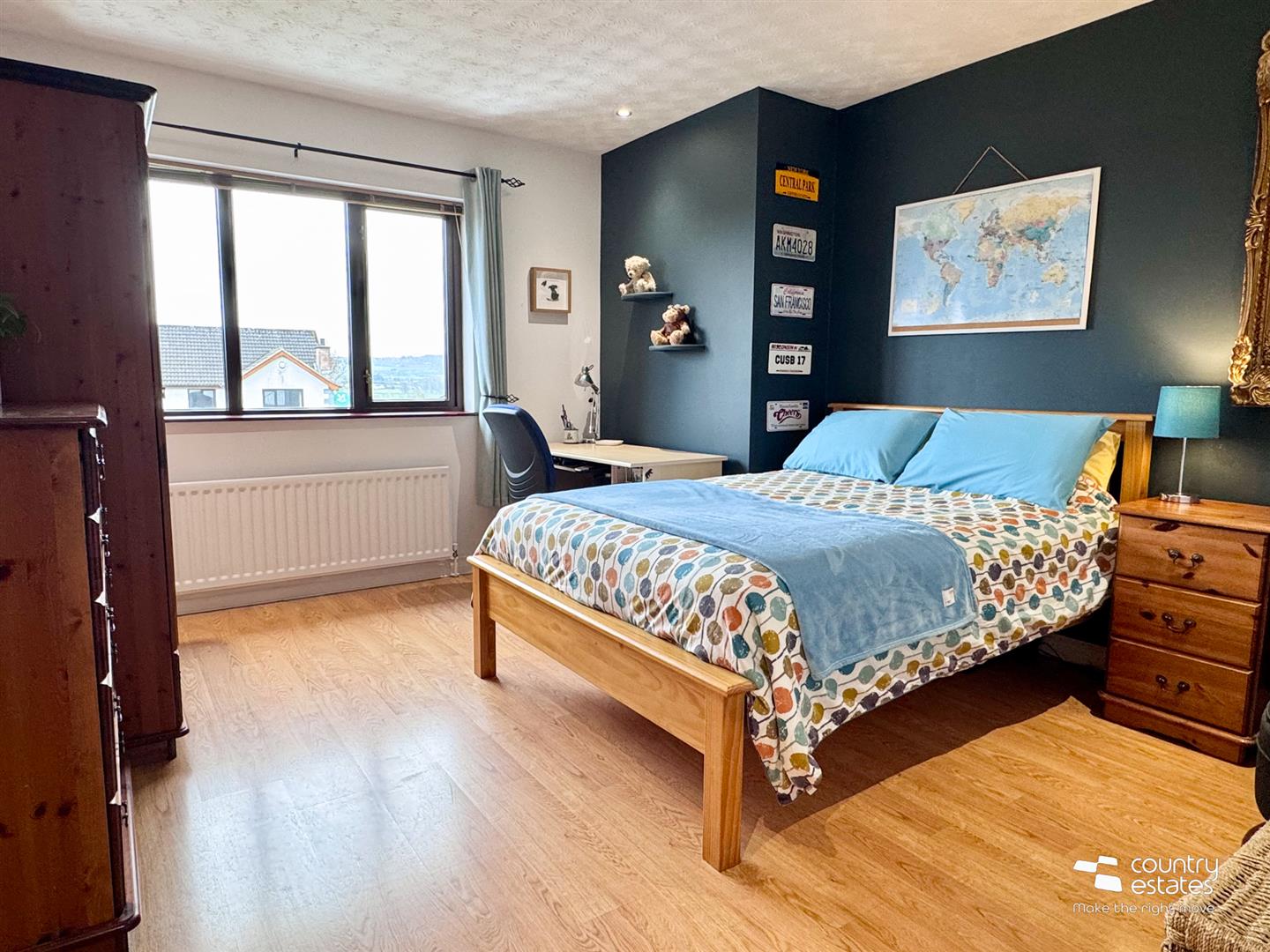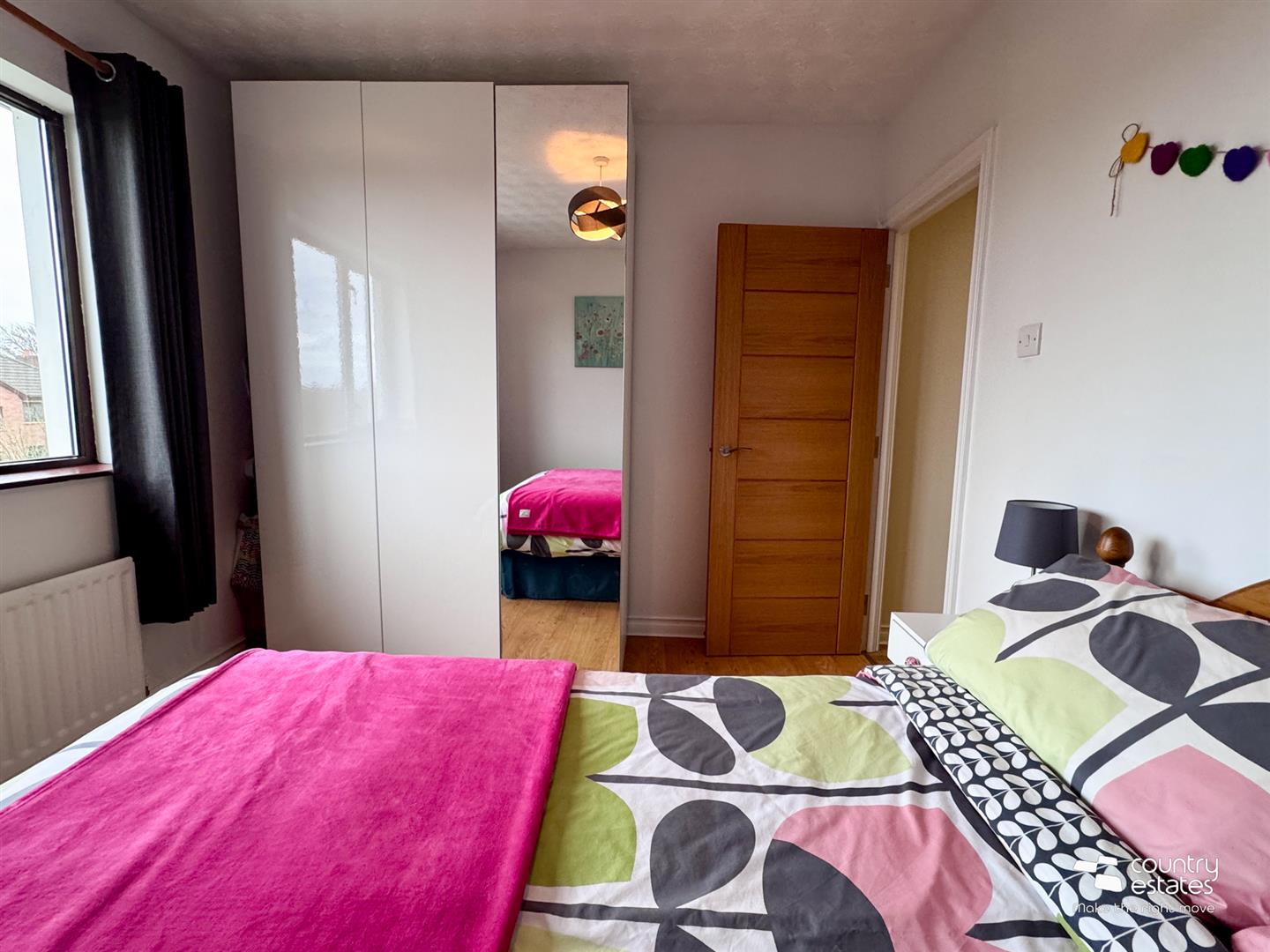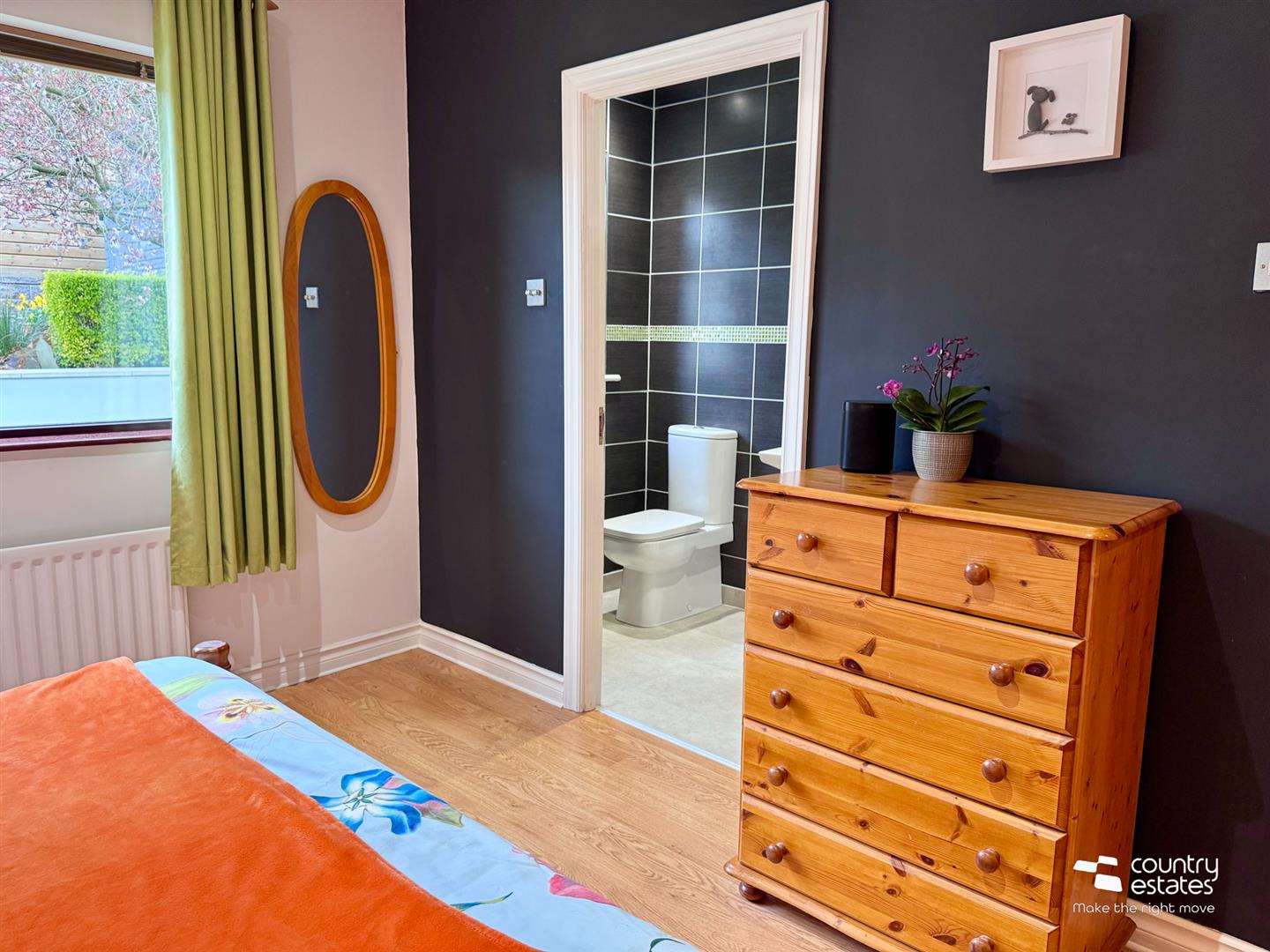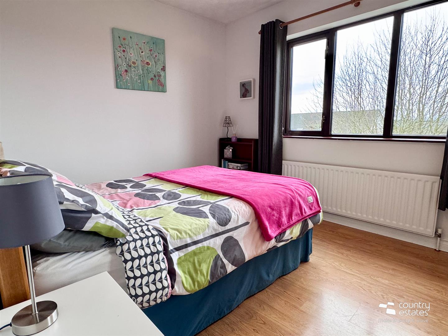 Attractive cast iron open fireplace with ornate tiled inset and painted wooden surround on granite hearth. Oak strip laminate flooring. Coved ceiling. Feature corner window with dual aspect, views over cul de sac extending towards surrounding countryside.