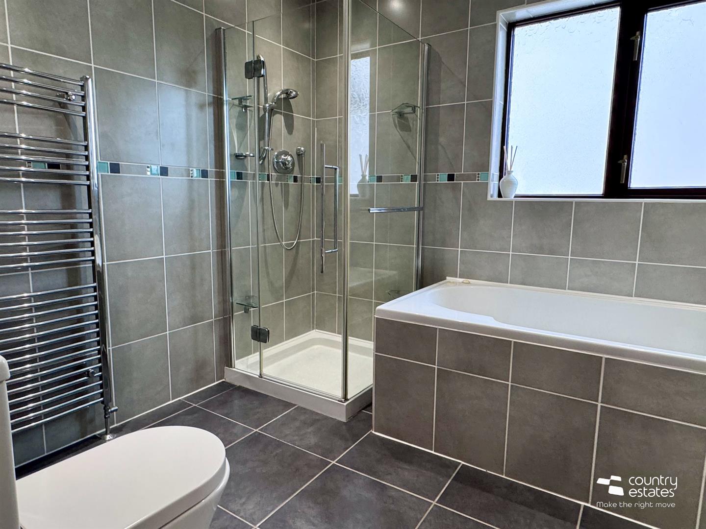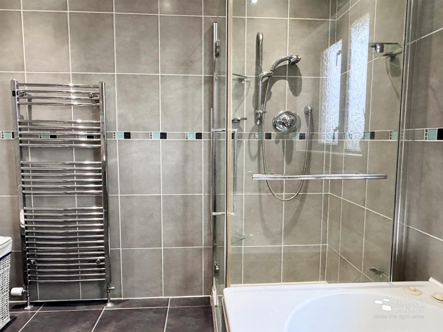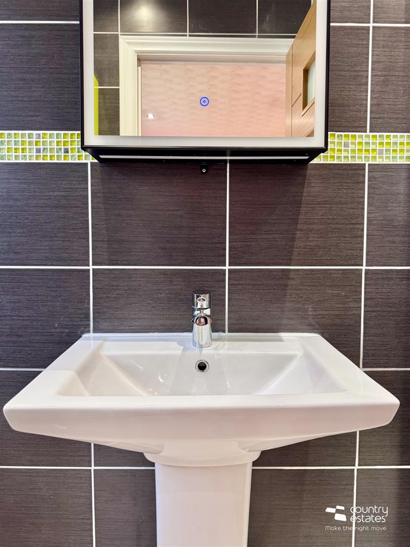 Comprising button flush w.c, fully tiled shower enclosure with thermostatically controlled shower, tiled boxed Jacuzzi bath and pedestal wash hand basin with mono block tap. Fully tiled walls. Co-ordinating Tiled floor.