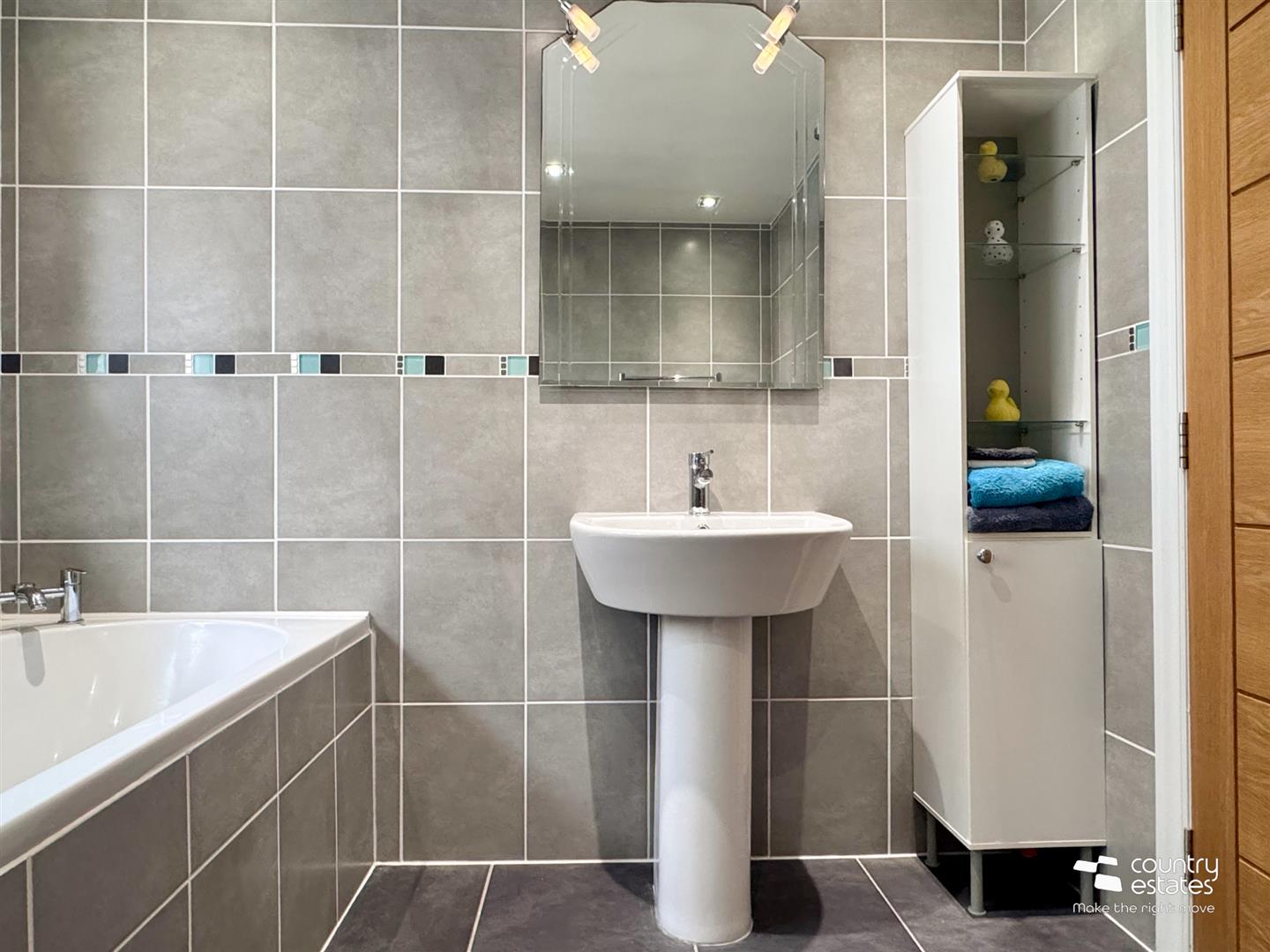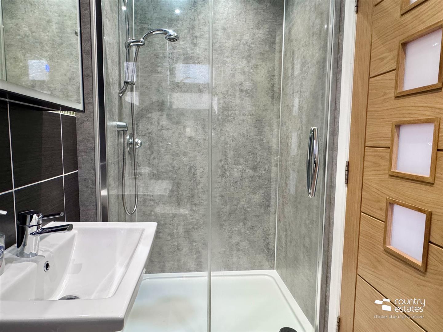 Comprising button flush w.c, pedestal wash hand basin with monobloc tap and large shower enclosure with multi panels, concrete elements effect (Linda Barker) and thermostatically controlled shower. Complementary wall tiling.
