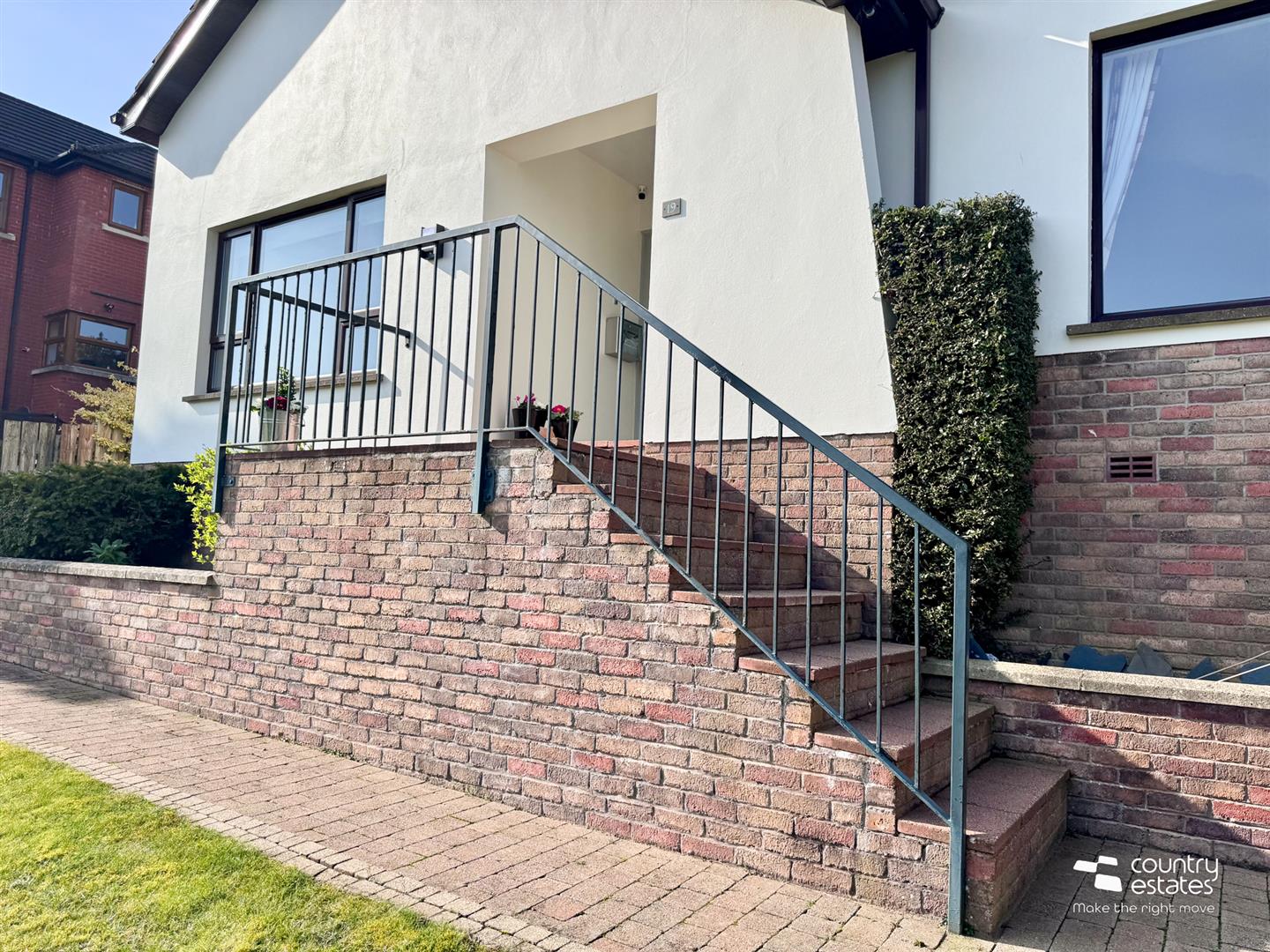 Extensive driveway to side with ample parking facilities for a number of vehicles. Electric vehicle charging point. Steps to entrance porch.
