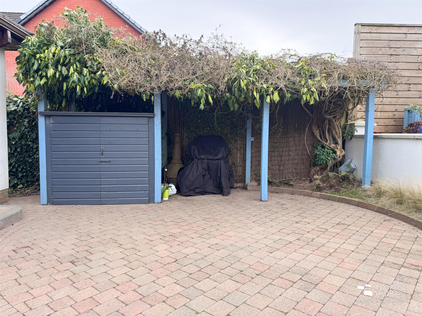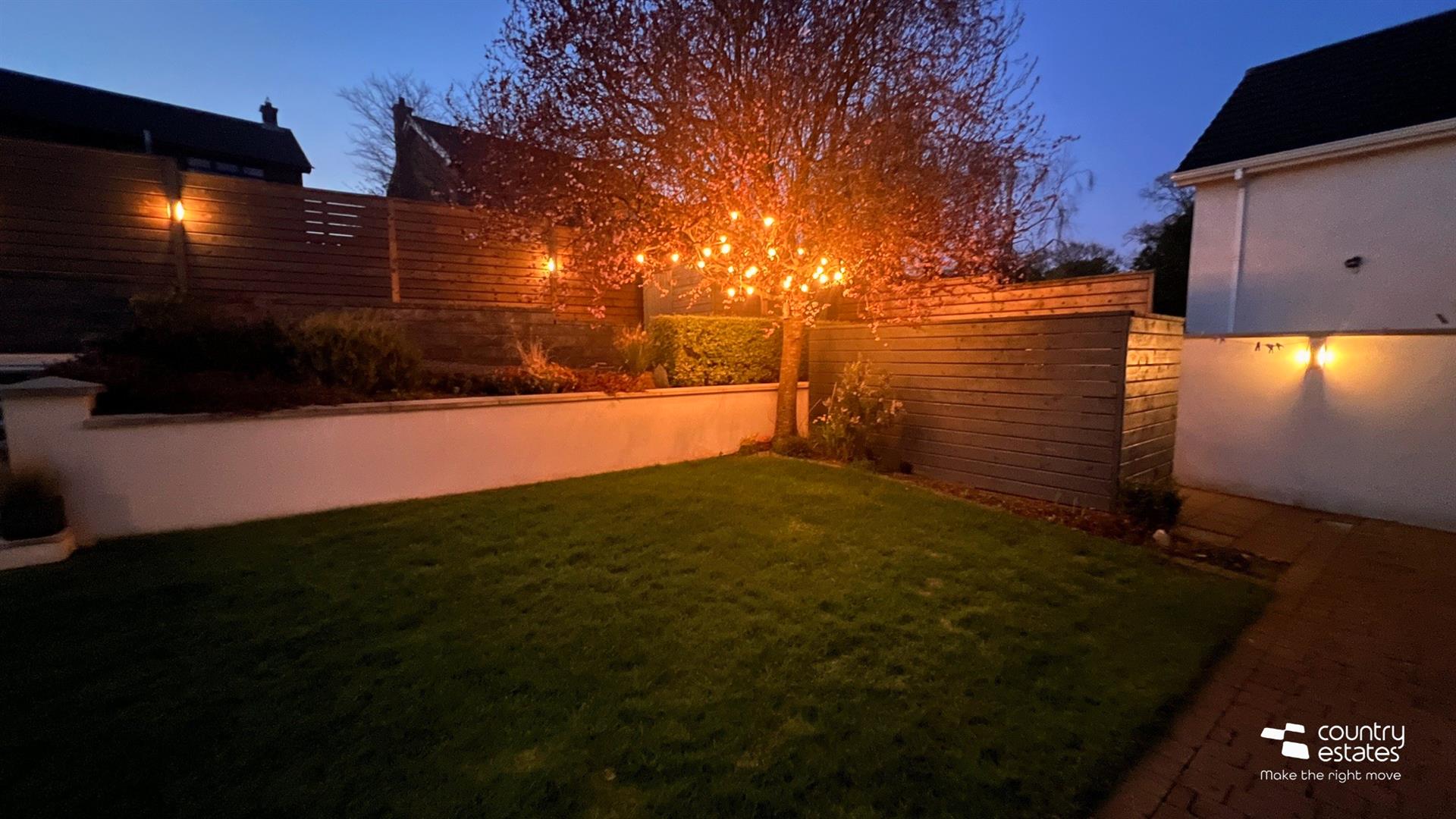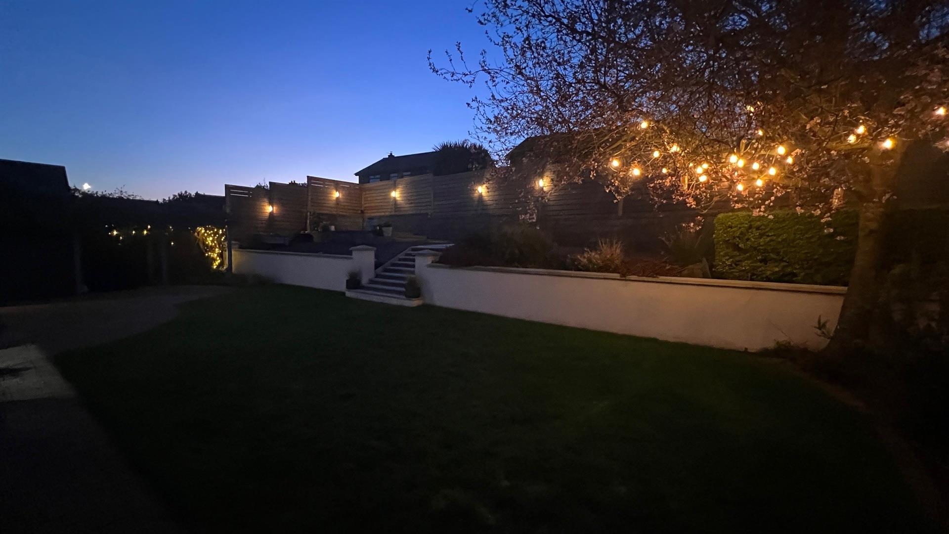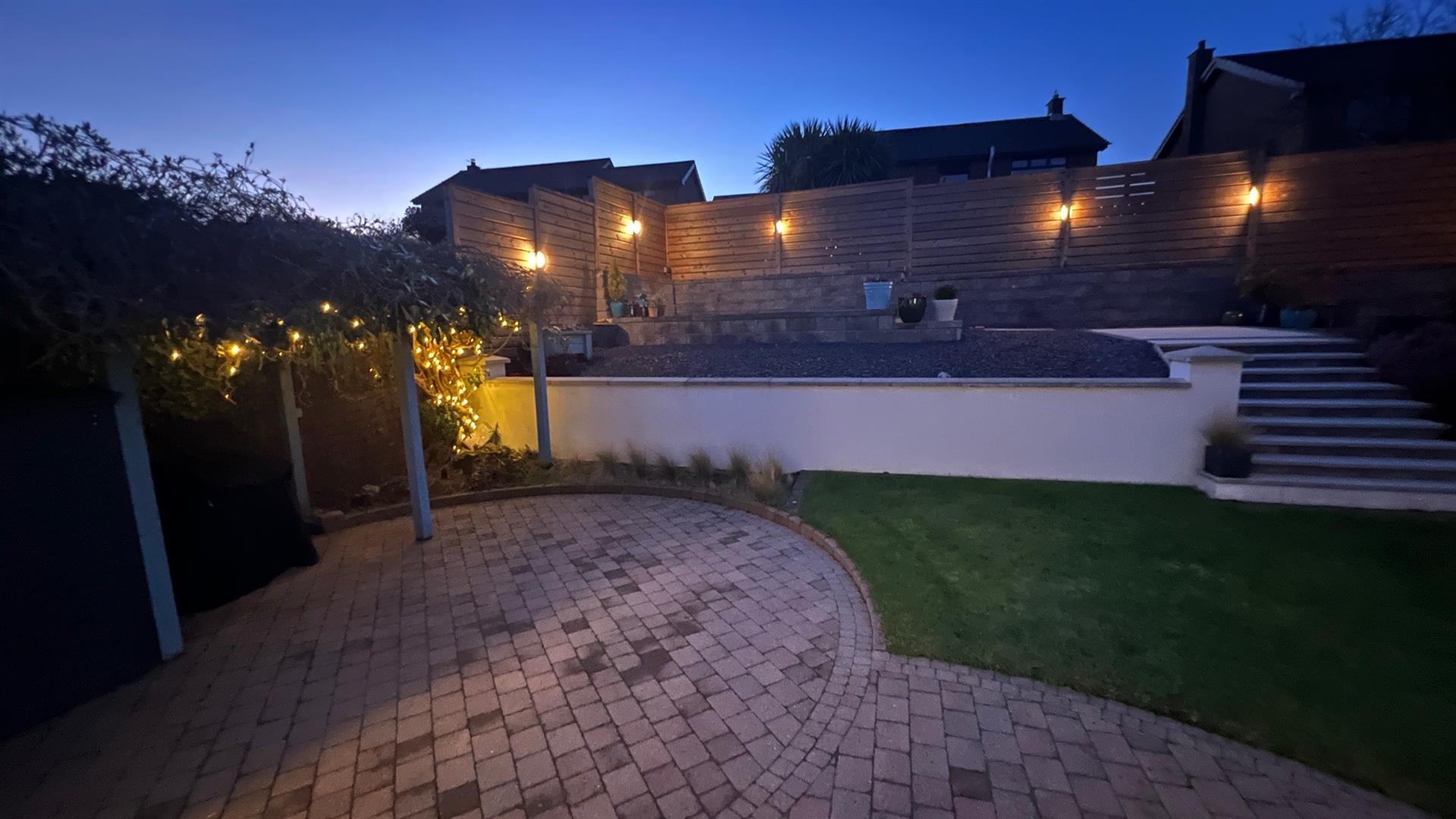 Professionally landscaped private garden to rear with brick paved patio and covered barbeque storage area. Garden laid in part lawn with paved walkway. Steps to raised secluded hard landscaped terrace and patio a perfect space for family barbecues or evening entertaining. Raised beds stocked with a variety of shrubs and plants. Garden screened to rear by perimeter wall and fence with fixed outside lights.