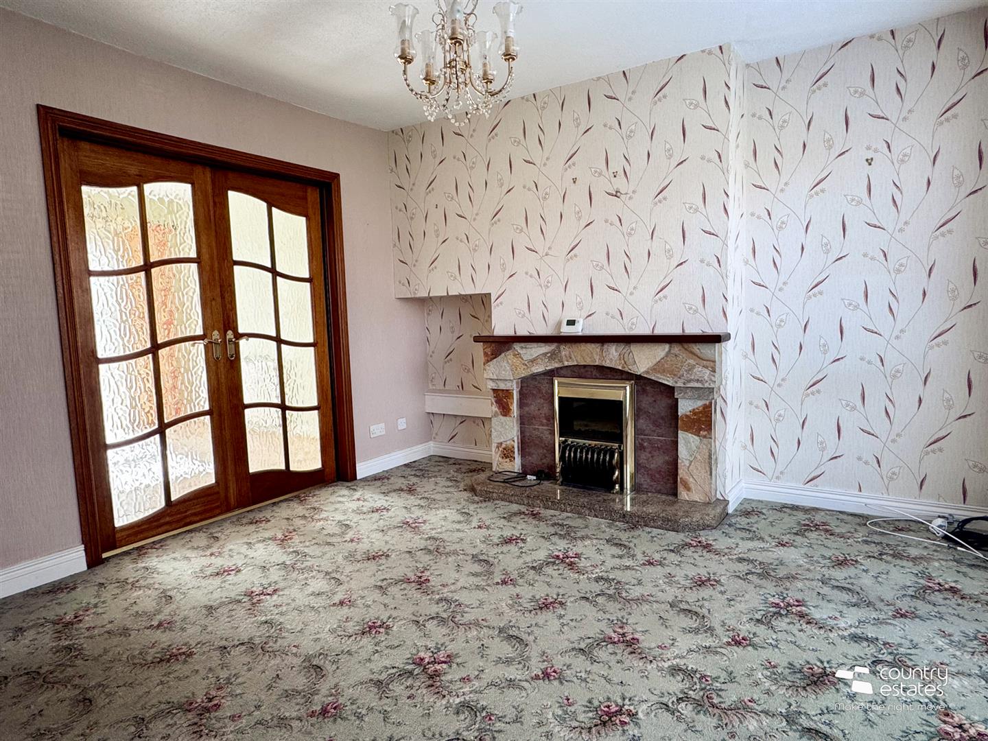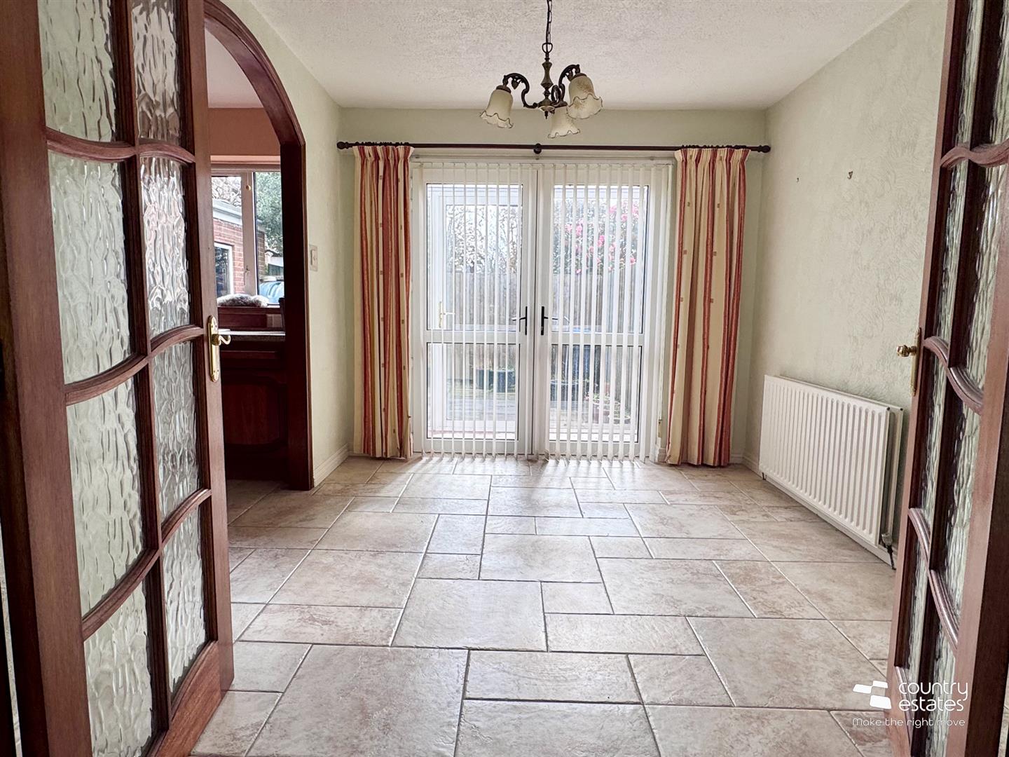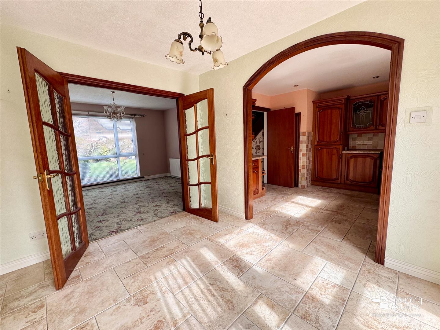 Twin PVC double glazed doors to rear porch. Tiled floor. Open arch into:-