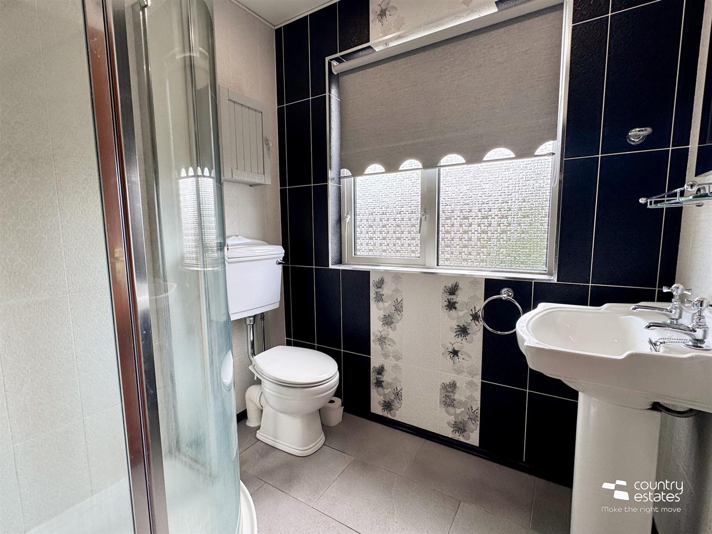 Comprising low flush w.c, pedestal wash hand basin and quarter rounded shower cubicle. Fully tiled walls. Tiled floor.