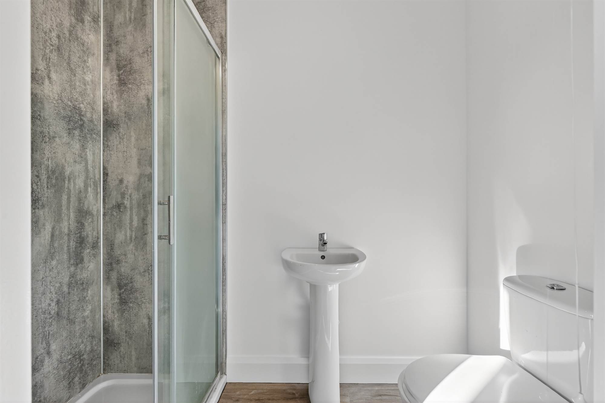 White suite comprising large shower cubicle with shower panels, electric Mira shower, low fush wc, pedestal wash hand basin, laminate wood effect floor.