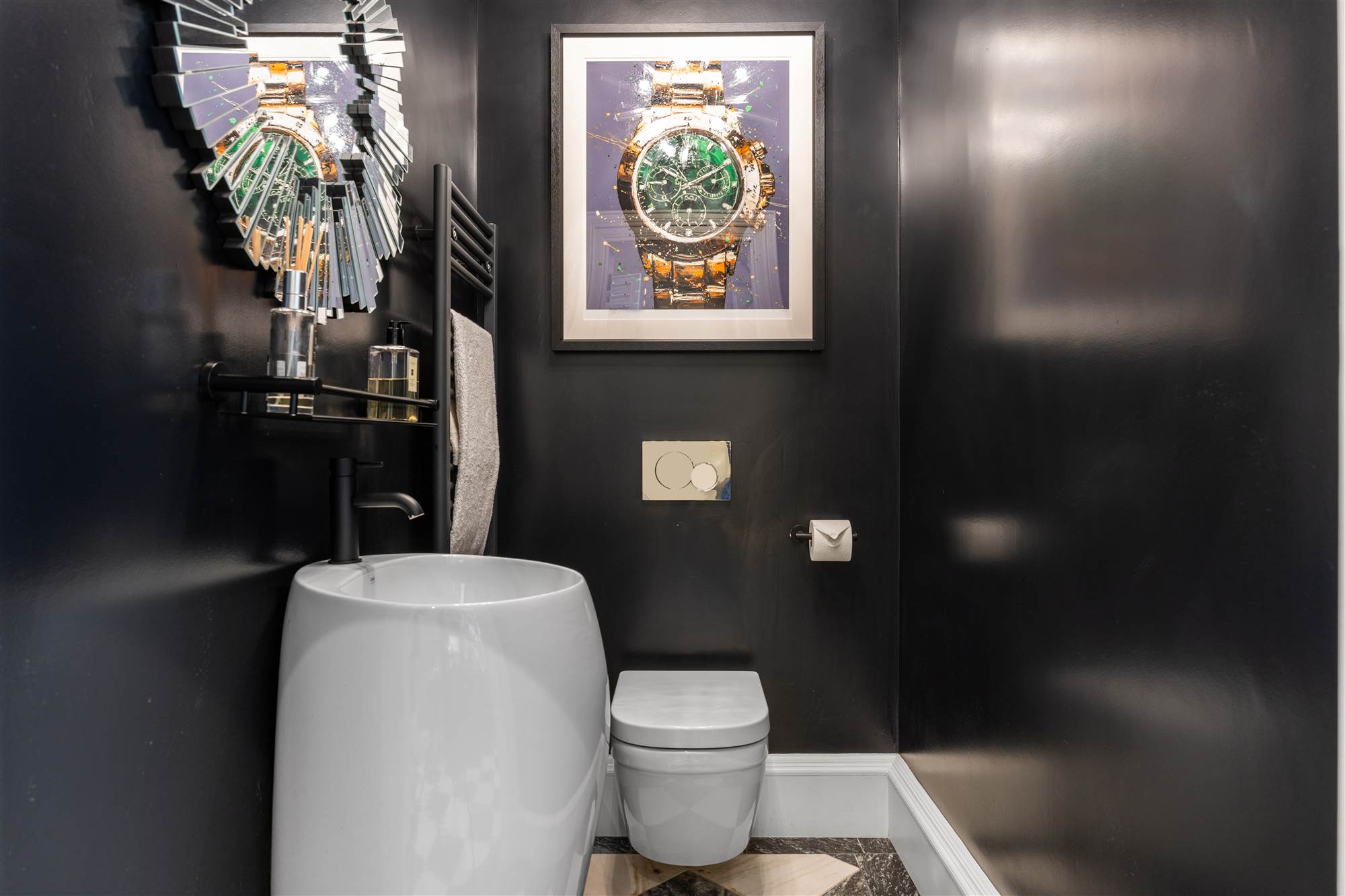 White suite comprising low flush wc, fully tiled shower cubicle with black drencher and hand held shower, feature vanity unit on feet with rectangular wash hand basin and black fittings, both inset on black surround with black tap and shower head, feature mirrored tiling, marble floor tiles, heated towel rail, cornice ceiling, low voltage spotlights, extractor fan.