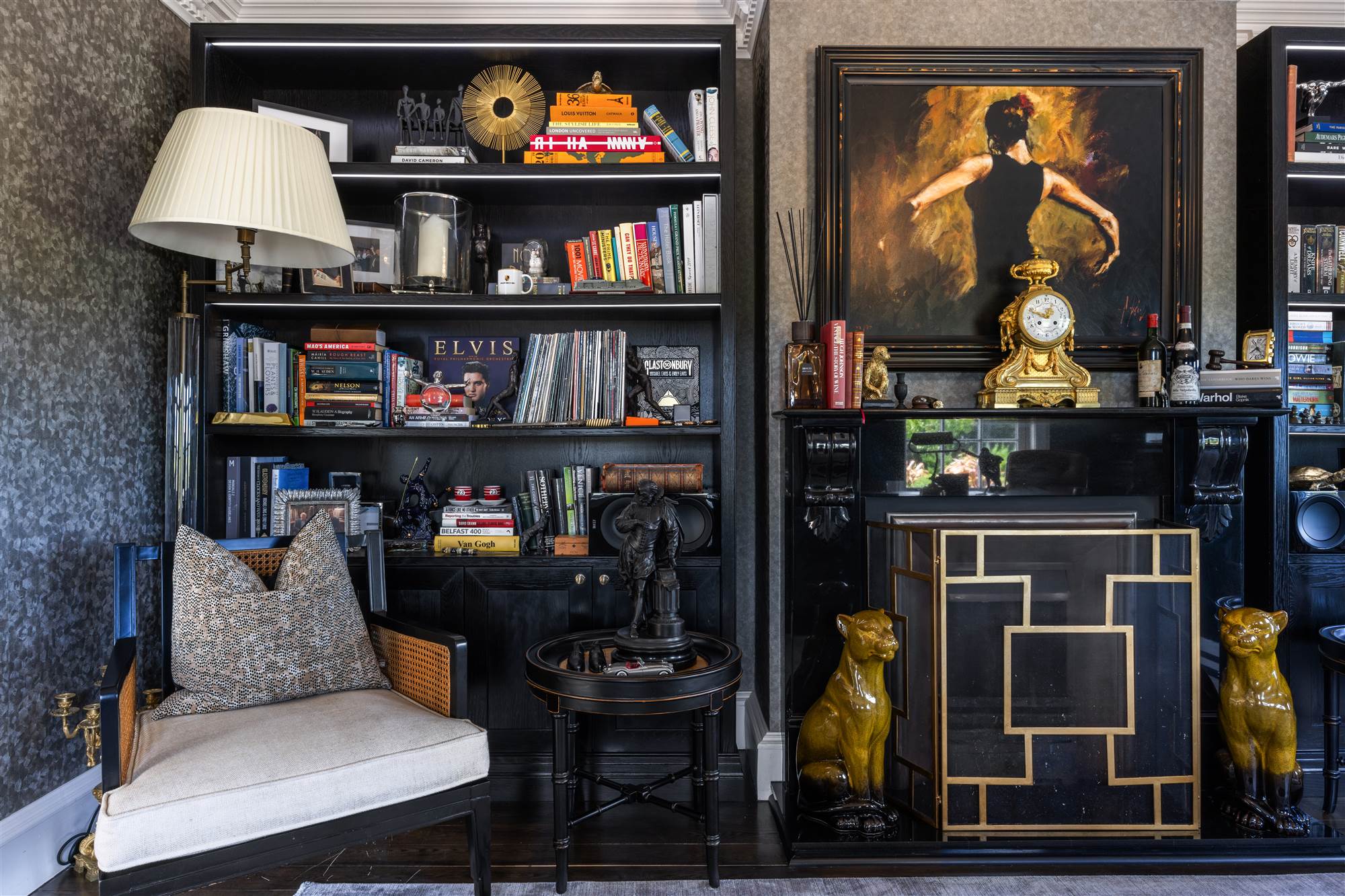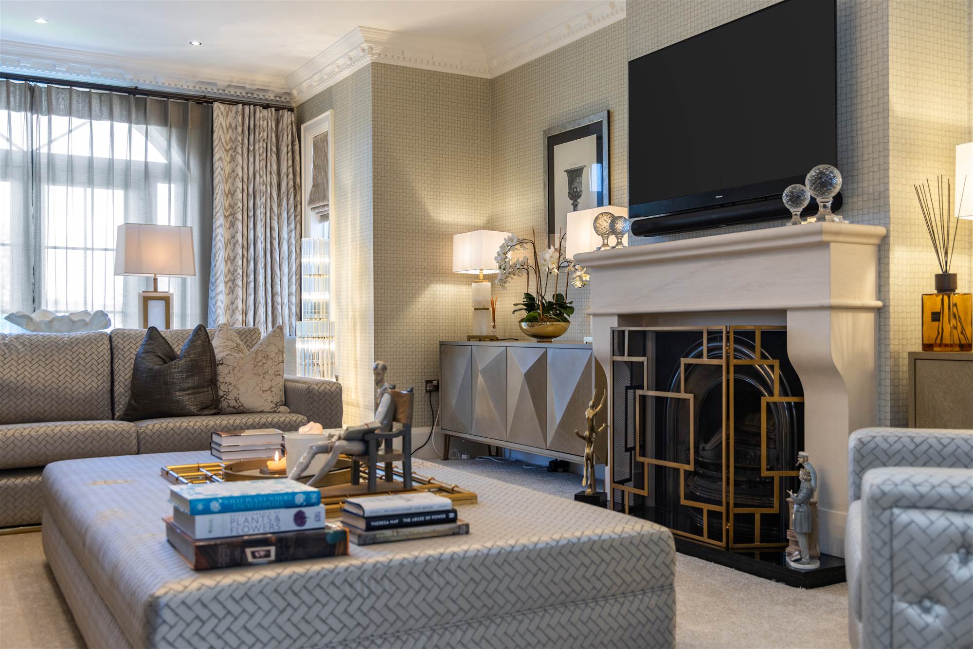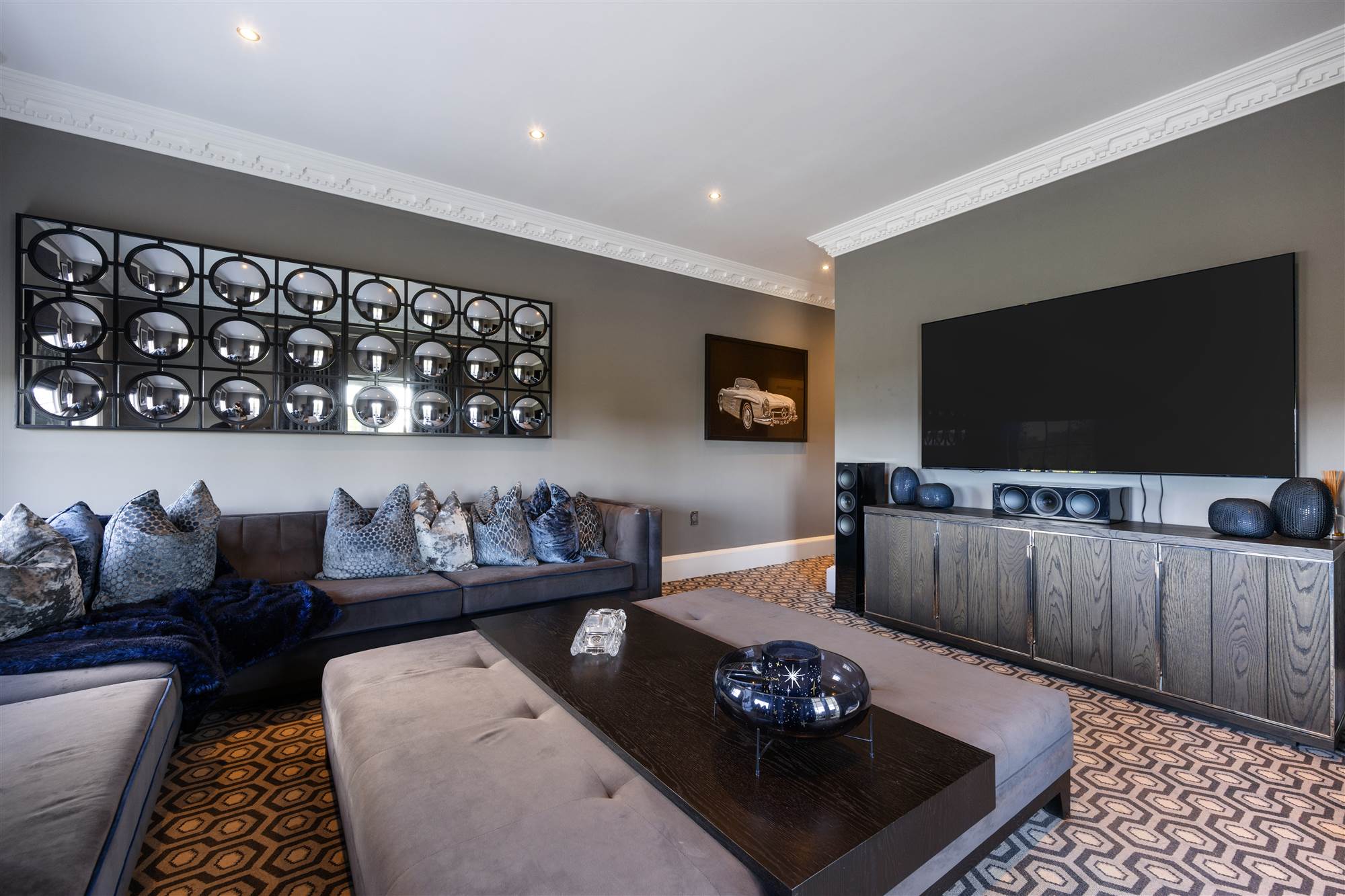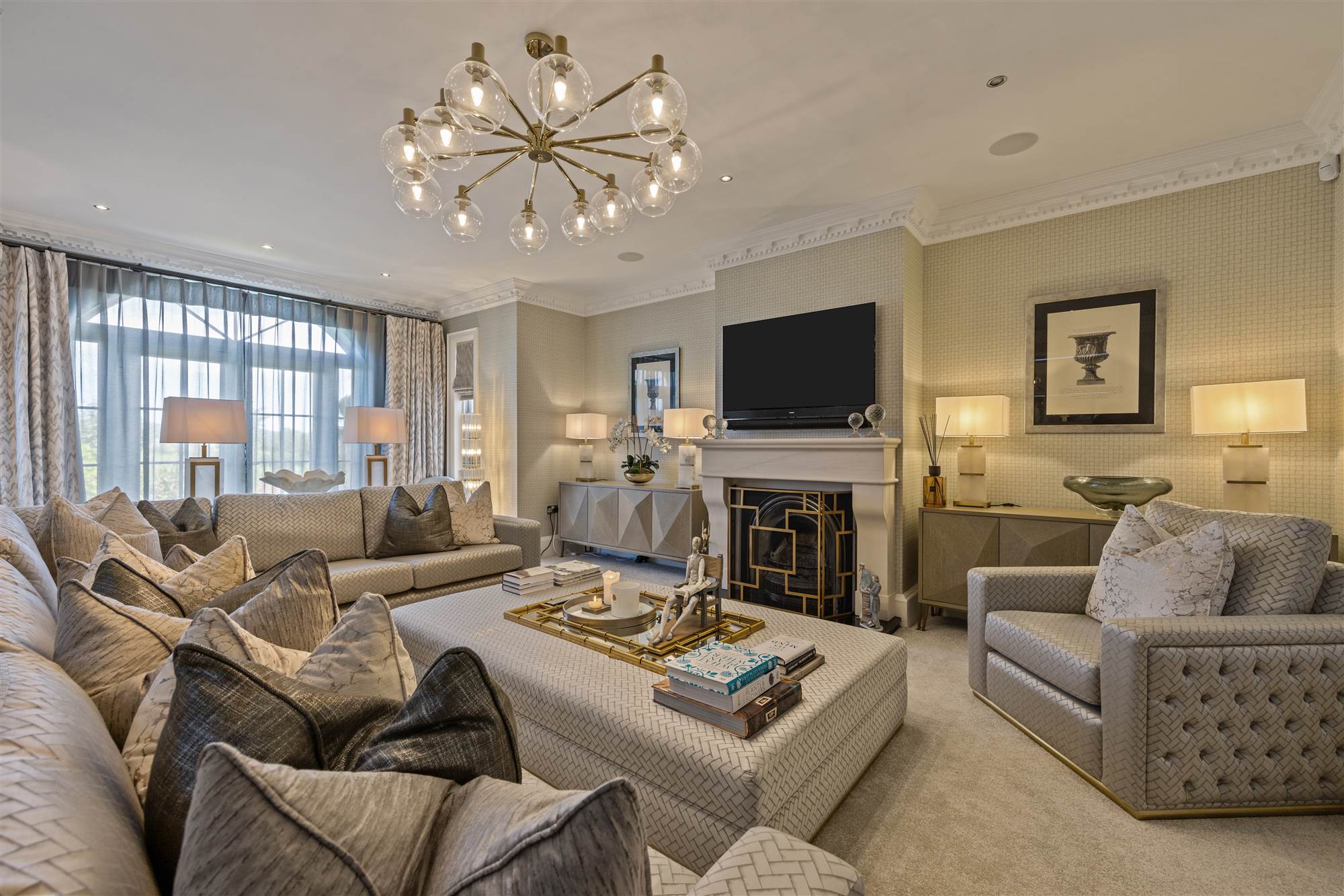 Solid wood floor, cornice ceiling, ceiling rose, polished stone fireplace with cast iron inset and granite hearth, twin built-in shelving and storage units with feature lighting, surround sound speakers.