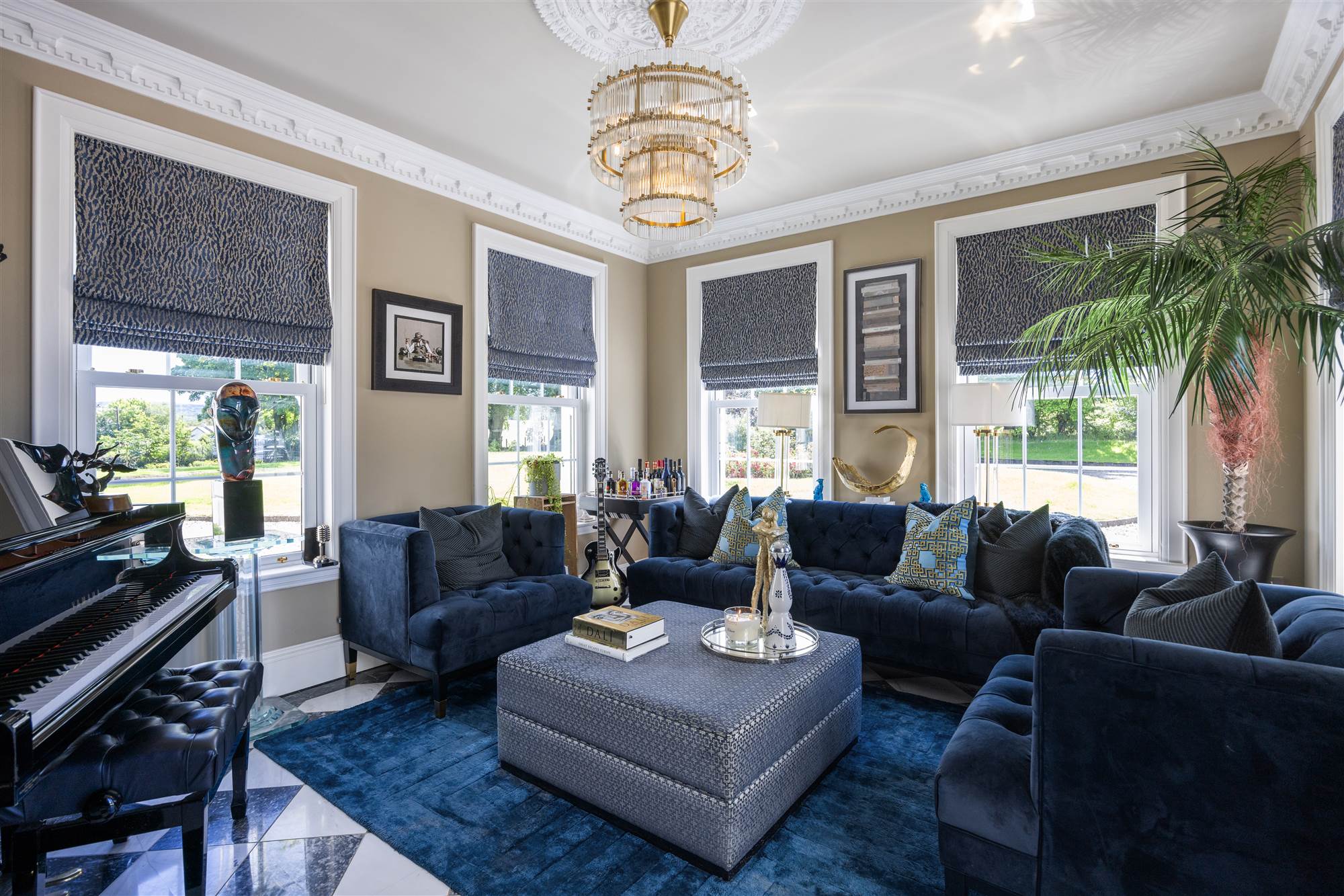(at widest points). Solid wood floor, cornice ceiling, marble fireplace with cast iron inset and granite hearth, ceiling rose, surround sound speakers.