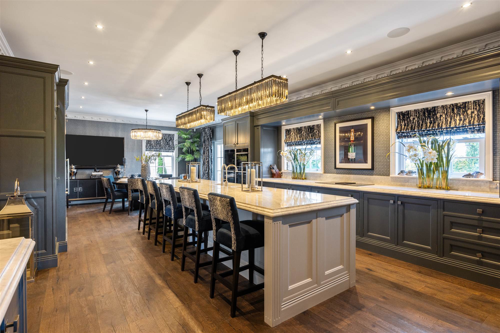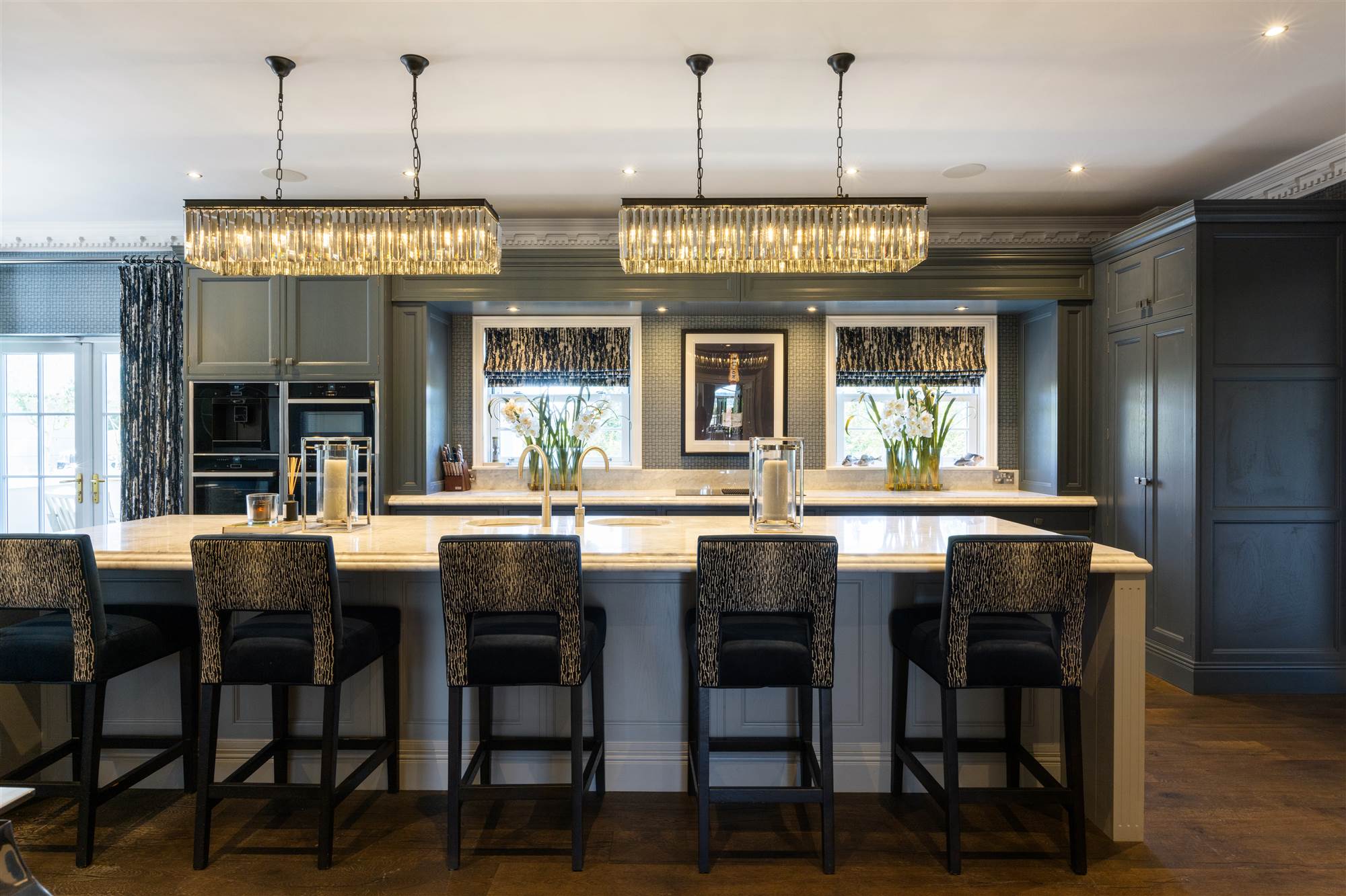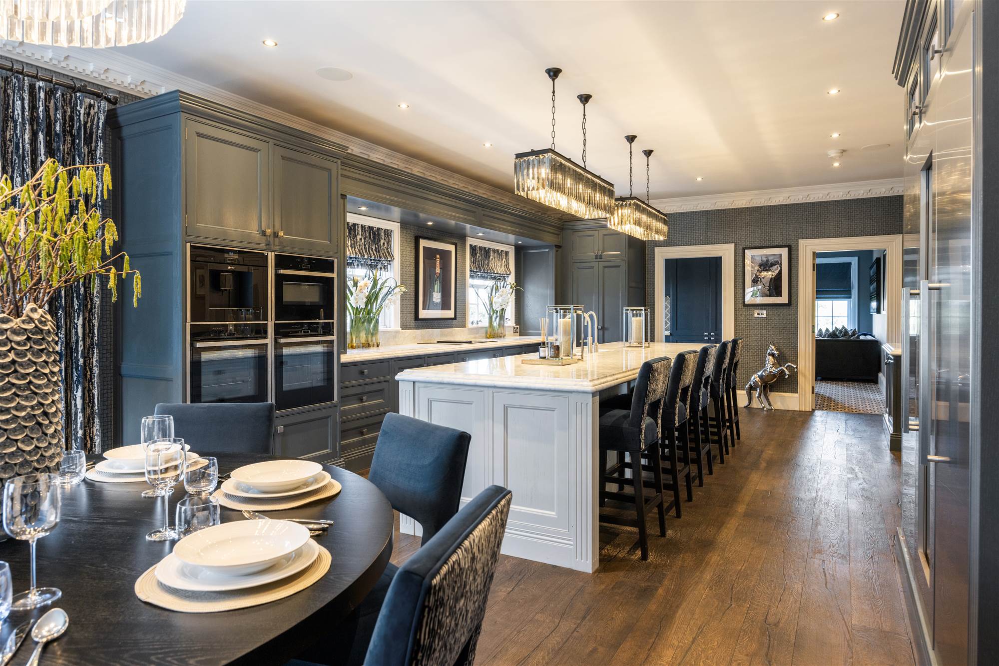 Stunning, Hand Painted Kitchen with Marble Work Surfaces and High End Integrated Appliances with Casual Dining Area