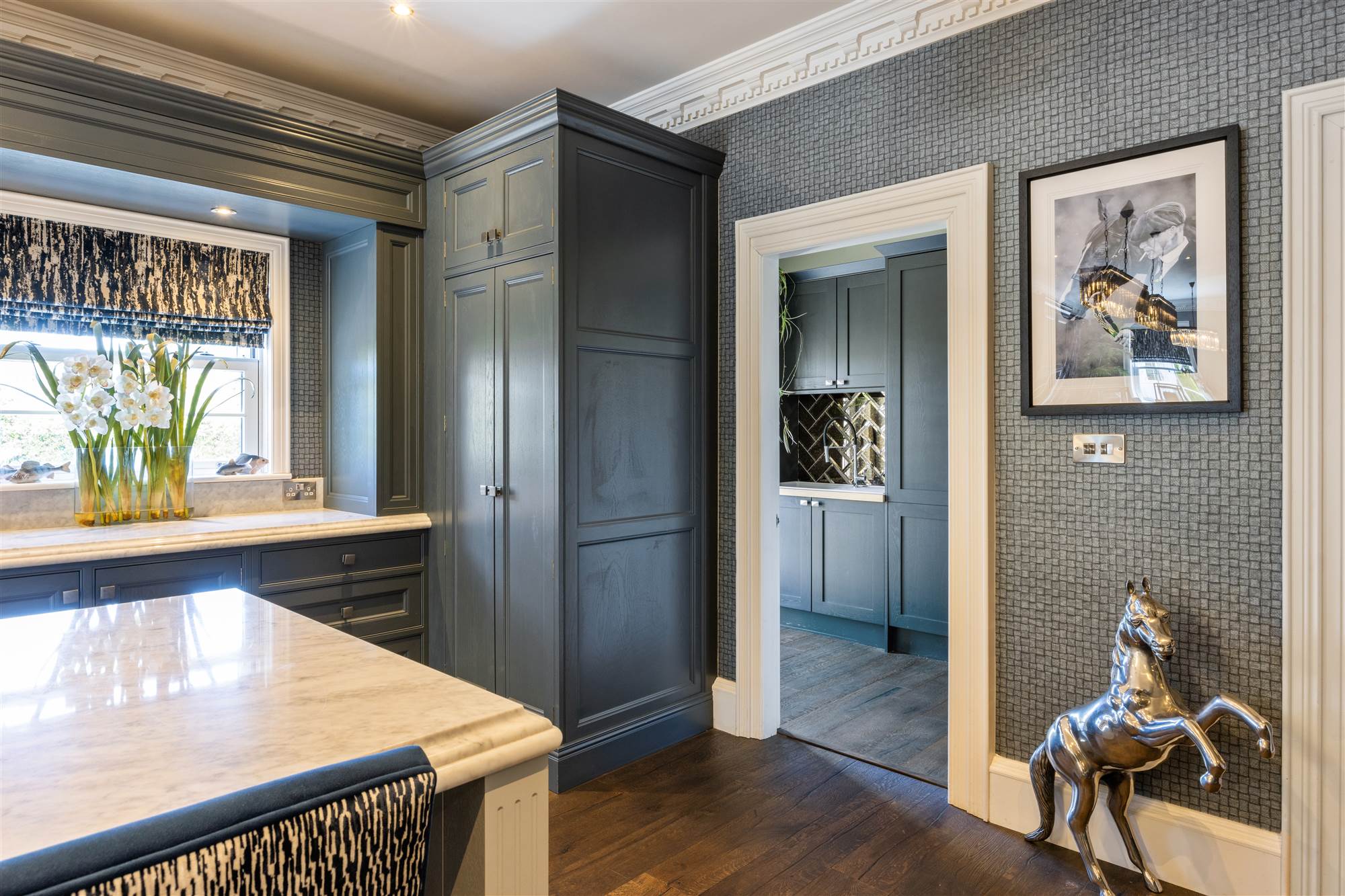 (at widest points). Hand painted range of high and low level units, stone work surfaces, three Neff integrated ovens, Neff integrated coffee machine, integrated hob, built-in pantry cupboard, large island unit with twin ceramic sinks with Quooker taps, pull-out bin cupboard, integrated AEG dishwasher, breakfast bar area for five people, integrated Liebherr fridge and freezer, cornice ceiling, low voltage spotlights, wood floor, patio doors to rear garden/patio area. Comms cupboard off kitchen.