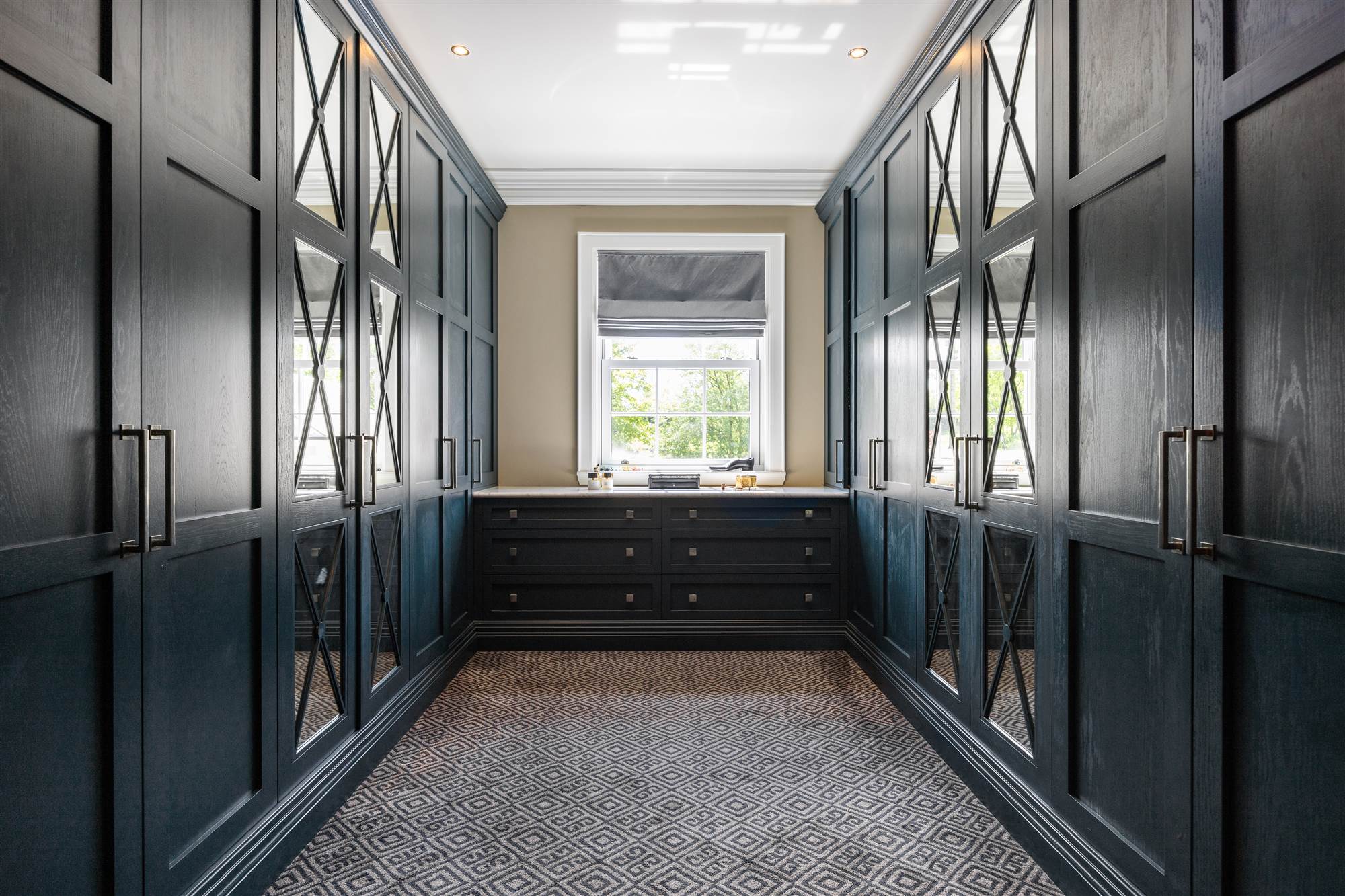 Bespoke Abbey Upholsters range of robes with extensive rails and shelving and feature glazed doors, low voltage spotlights, cornice ceiling.