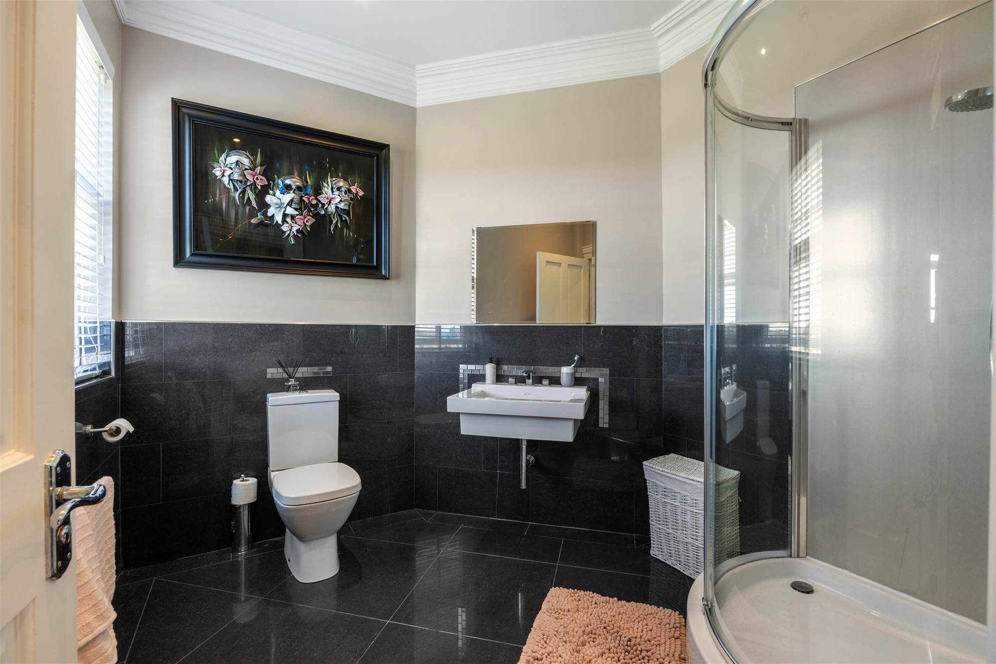 White suite comprising low flush wc, pedestal wash hand basin, sheeted shower cubicle with jet shower, built-in storage and shelving unit, part tiled walls, ceramic tiled floor, low voltage spotlights, extractor fan, cornice ceiling, surround sound speakers.