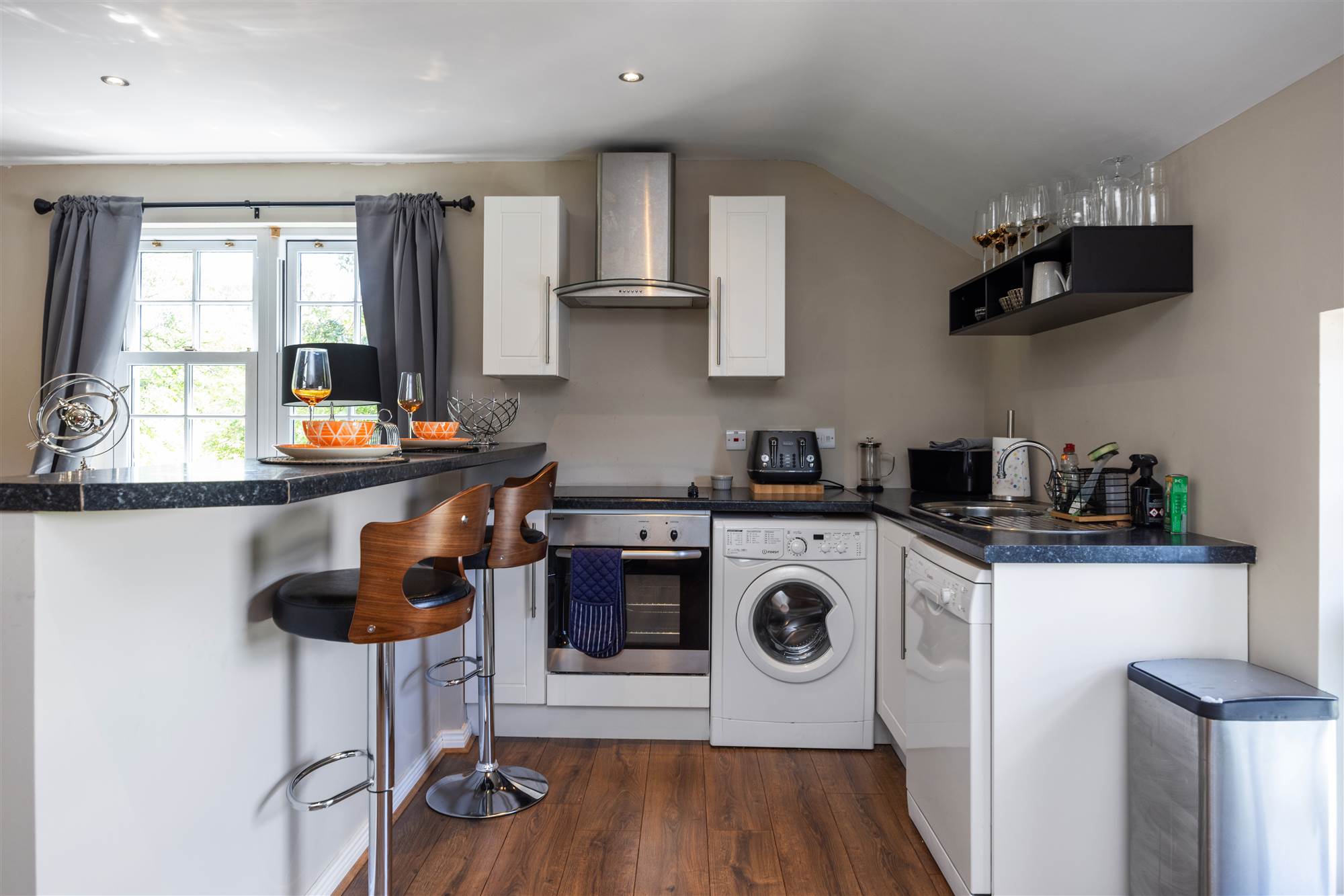 (at widest points). Range of high and low level units, circular stainless steel sink and drainer, integrated Beko oven and hob, stainless steel extractor fan over, Bosch dishwasher, integrated fridge and freezer, breakfast bar, wood floor, low voltage spotlights.