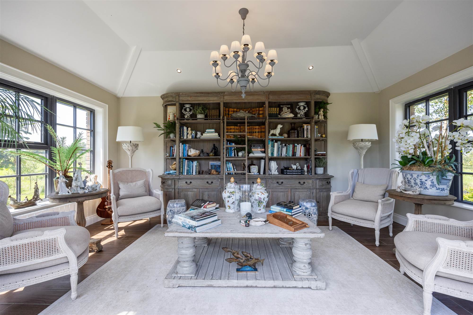 (at widest points). Sandstone fireplace with cast iron inset and granite hearth, cornice ceiling, low voltage spotlights, surround sound speakers, uPVC patio doors to side with country views, extensive bespoke built-in shelving and display units.