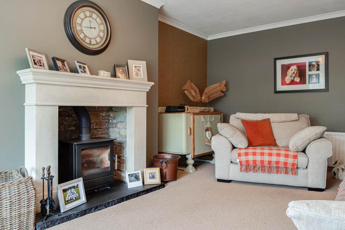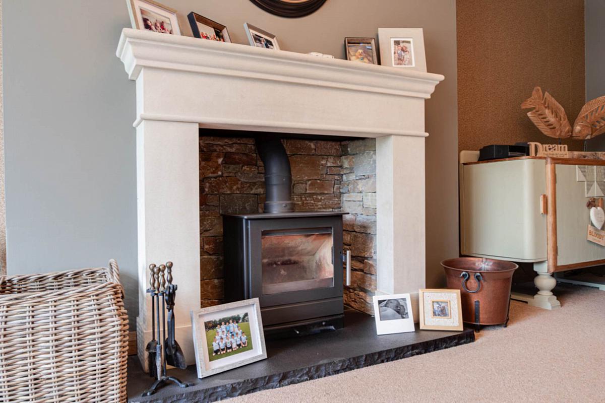 Feature fireplace with inset cast iron stove on slate hearth, cornice ceiling.