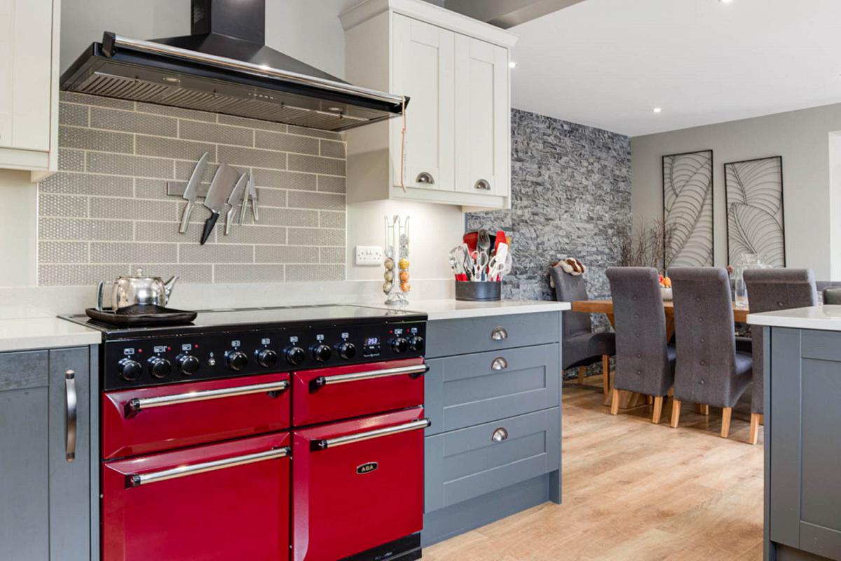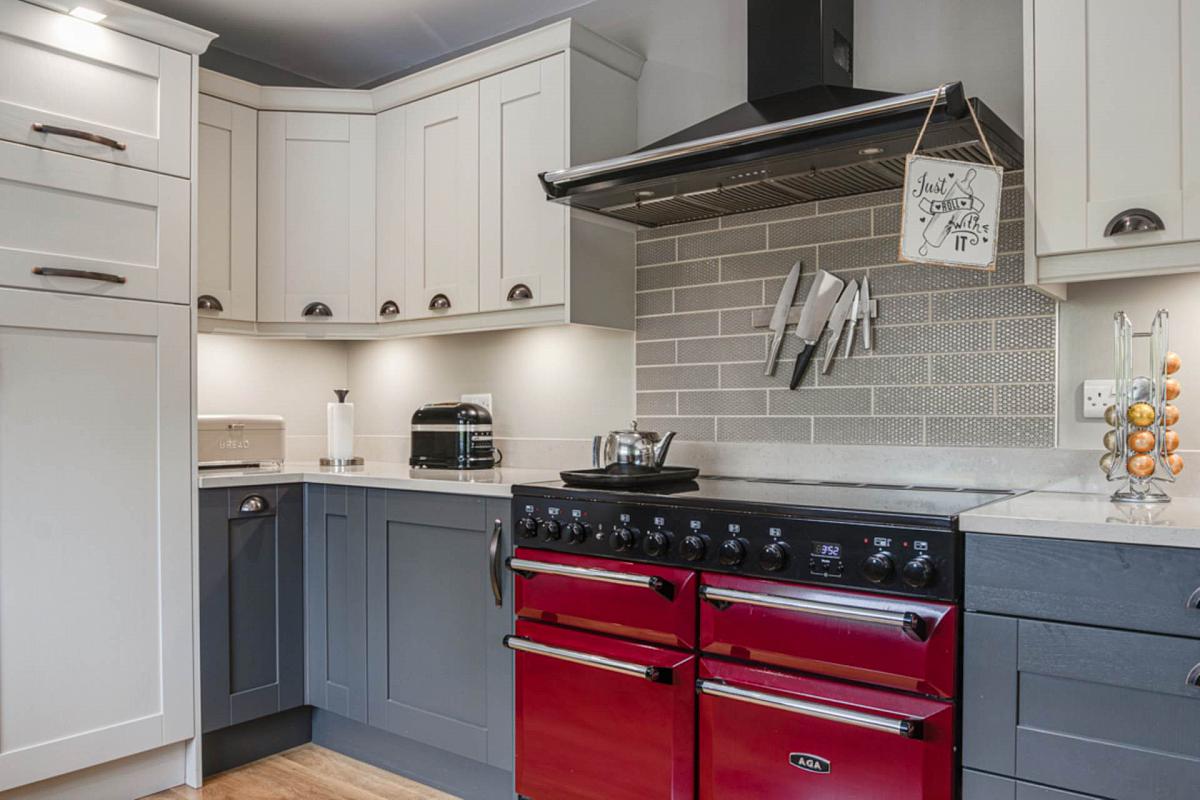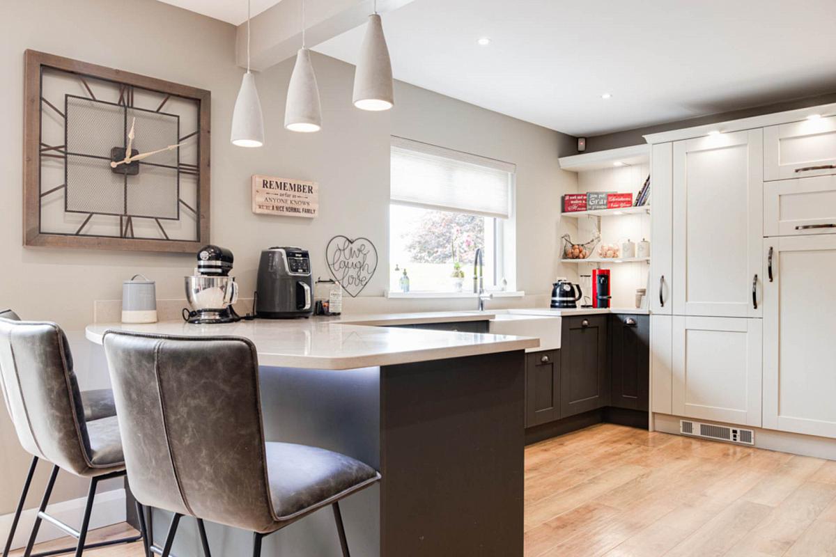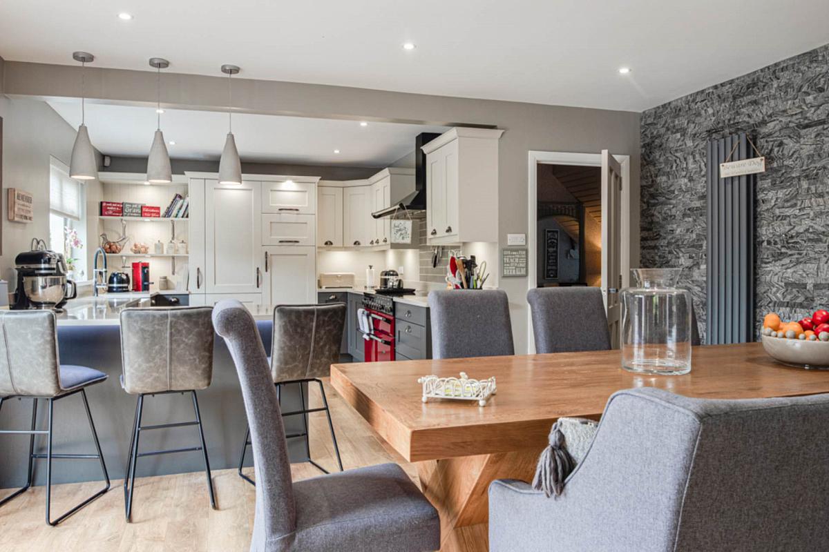 Luxury range of high and low level units, with complimentary work surfaces incorporating breakfast bar. Twin sinks with mixer tap. Space for range style cooker with overhead extractor canopy. Integrated dishwasher, washing machine, tumble dryer, fridge and freezer. Display shelving. High intensity low voltage spot lighting. PVC french doors from Sun Room to rear garden. 'Karndean' flooring.