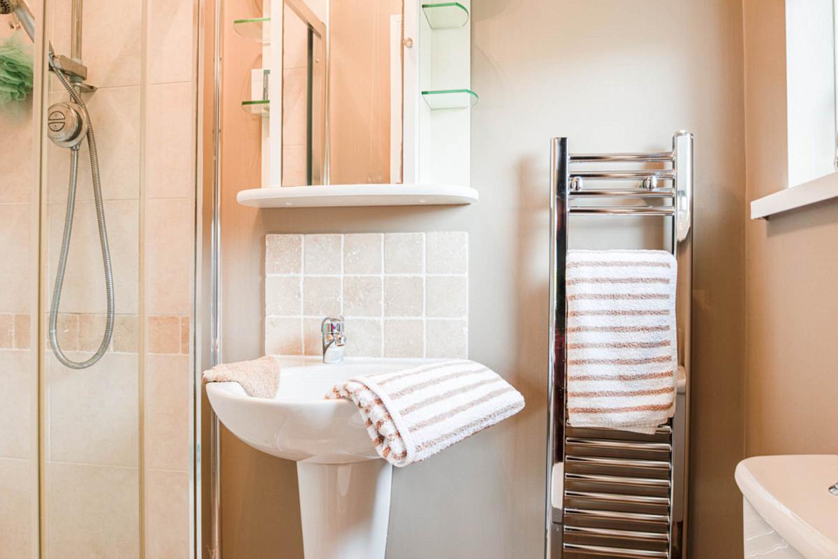 Superb white three piece suite comprising half pedestal wash hand basin, push button wc, double shower enclosure with sliding screen door and shower fitting, chrome wall mounted towel rail, complimentary wall tiling, ceramic tiled flooring