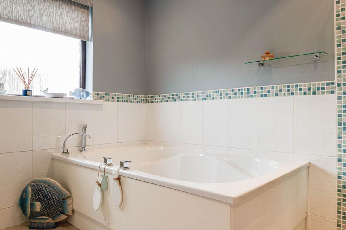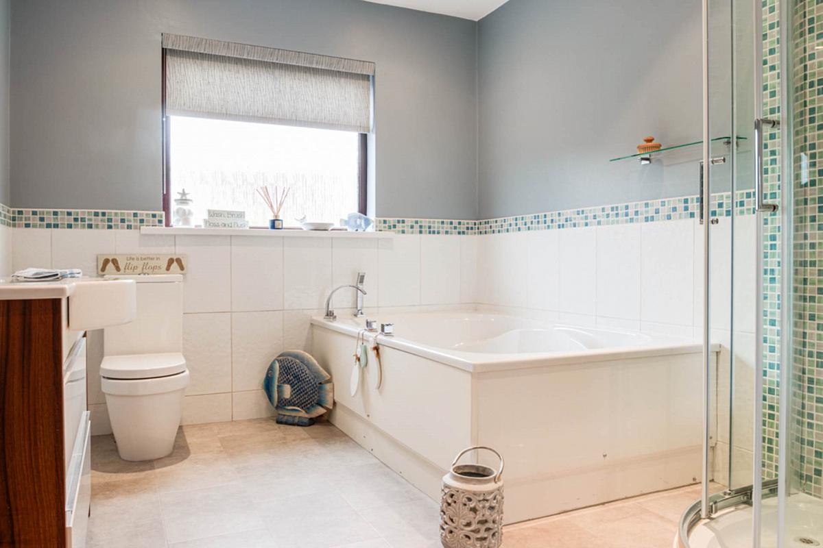 Lavish white four piece family bathroom suite on ground floor with first floor washroom with white two piece suite