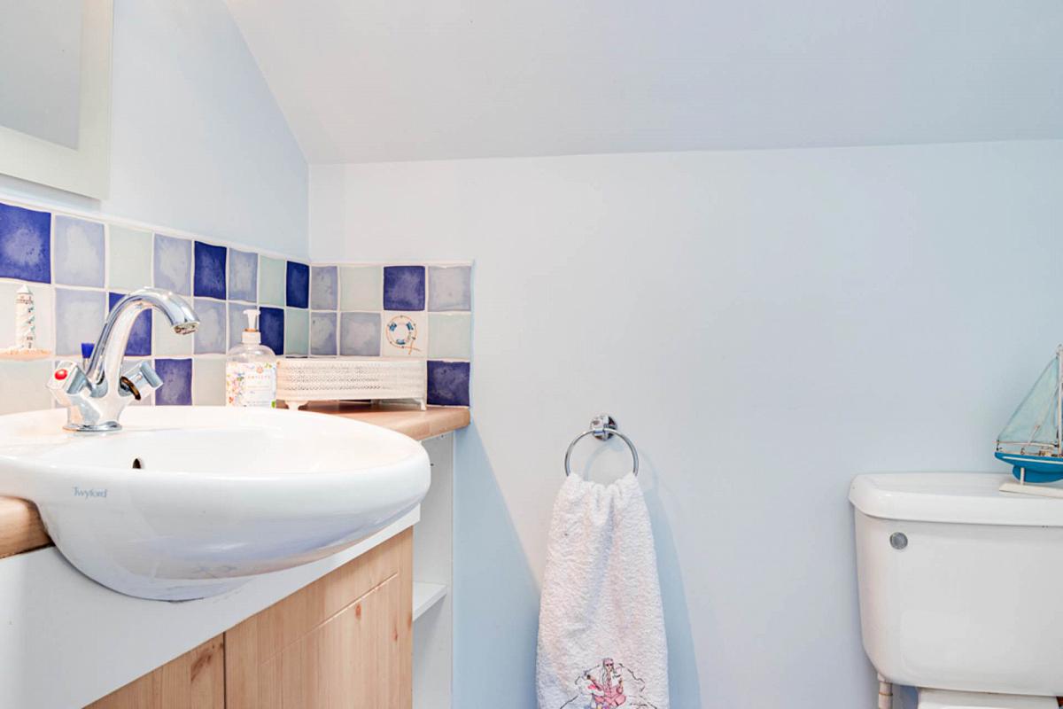 Vanitory unit with underbench double unit and side display shelving, low flush wc, complimentary wall tiling, velux window, ceramic tiled flooring