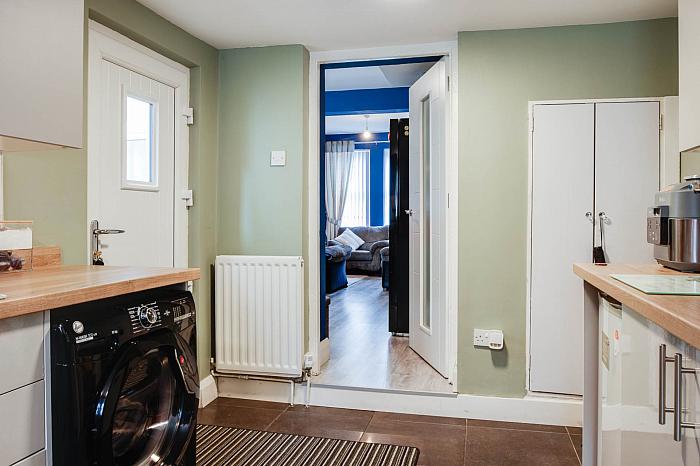 Ceramic tiled flooring, range of high and low level units with contrasting work surfaces, 5 ring gas hob with built in oven and overhead extractor canopy, single bowl stainless steel sink unit with mixer tap, under stair storage cupboard, part tiled walls. Plumbed for washing machine.