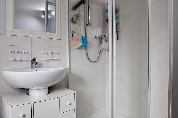 White four piece suite comprising panelled bath with telephone handset shower attachment, push button WC, pedestal wash hand basin with mixer tap, fully tiled shower enclosure with mains powered shower. Part tiled walls.