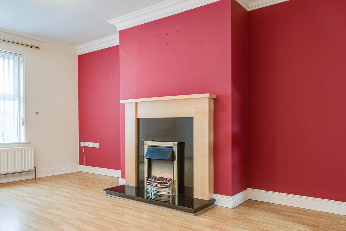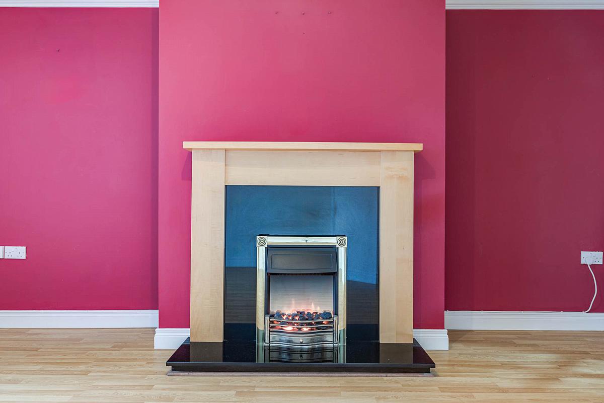 Attractive fireplace surround with inset electric fire. Laminate flooring.