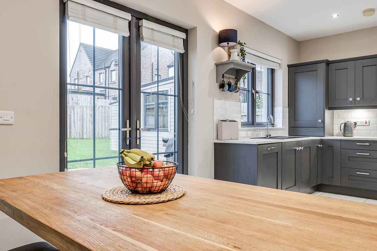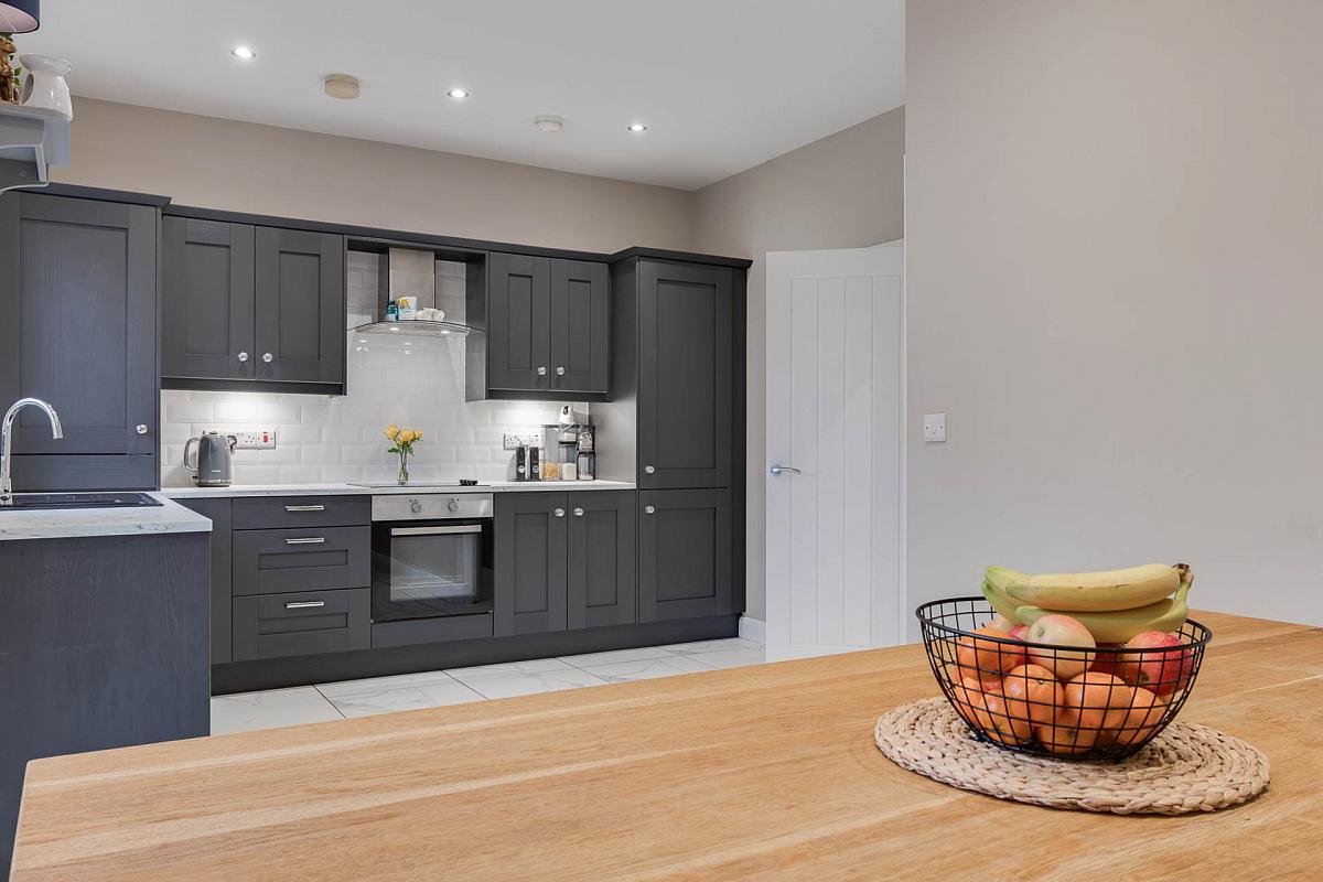 Luxury fitted kitchen with range of high and low level units with complimentary work surfaces. 1 1/2 bowl sink unit with mixer tap. Built in four ring hob with matching underbench oven and overhead extractor canopy. Integrated dishwasher and fridge/freezer. Complimentary wall tiling and ceramic tiled flooring. Open plan to dining room.
