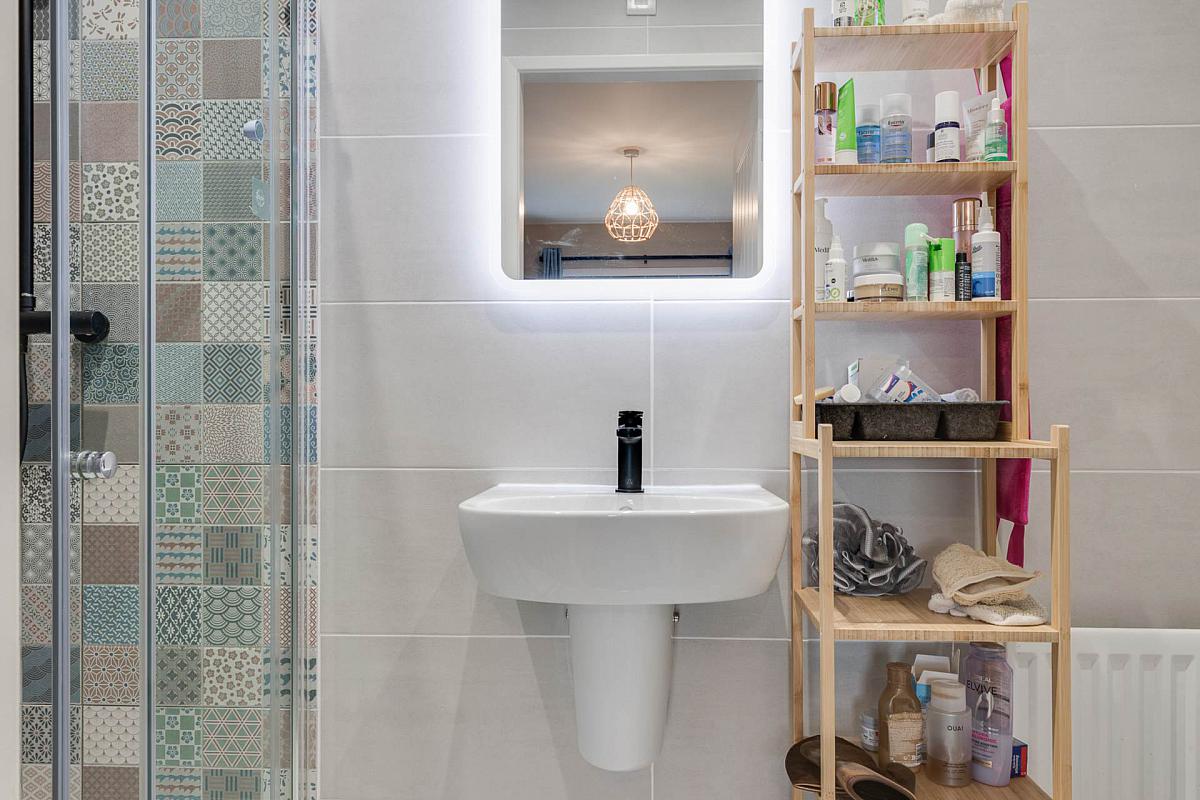White three piece suite comprising fully tiled shower enclosure with `Rainfall` Shower and glazed door. Half pedestal wash hand basin and push button wc. Complimentary wall tiling and ceramic tiled flooring.