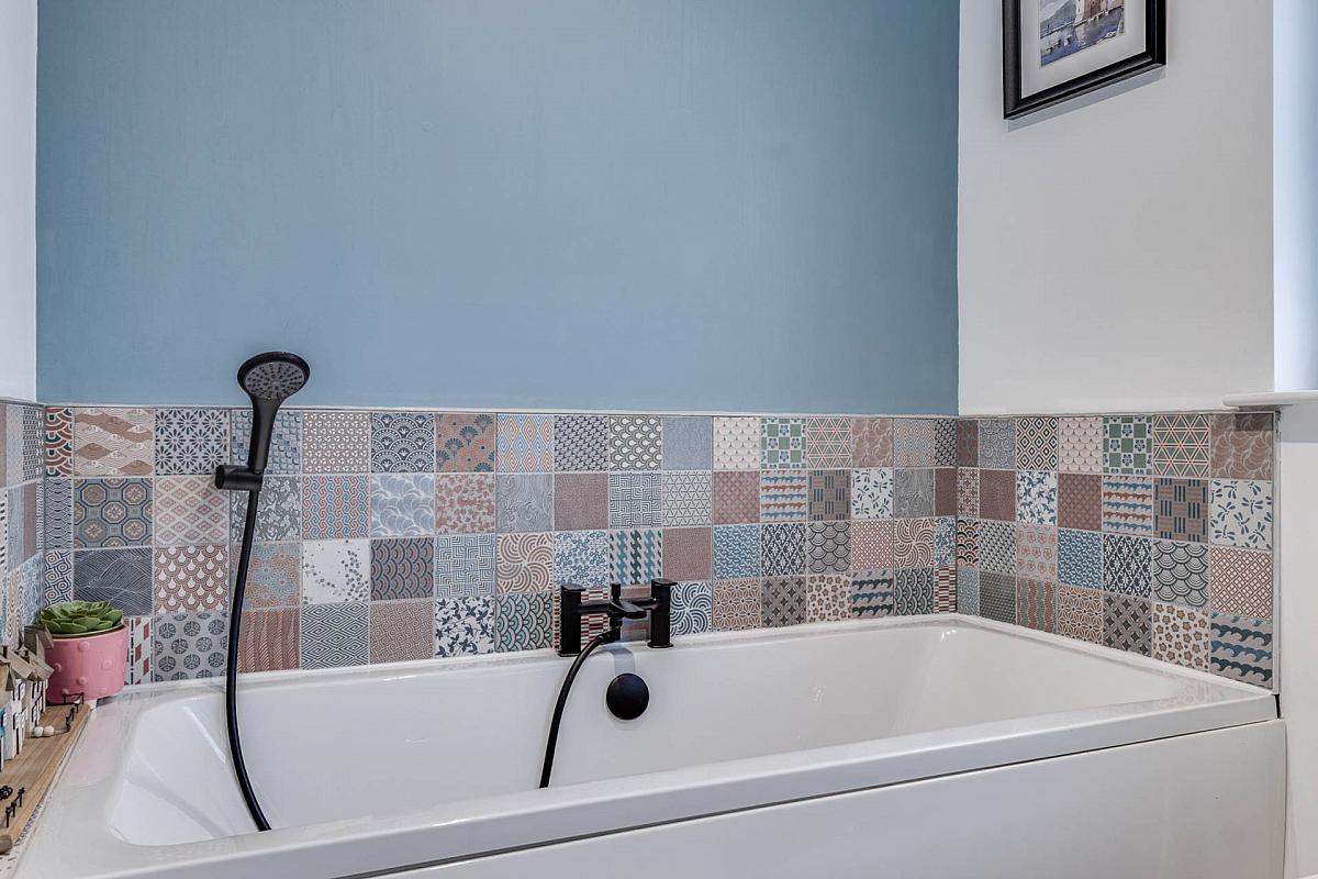 Superb white three piece suite comprising panelled bath hand shower attachment, half pedestal wash hand basin and push button wc. Complimentary wall tiling and ceramic tiled flooring.