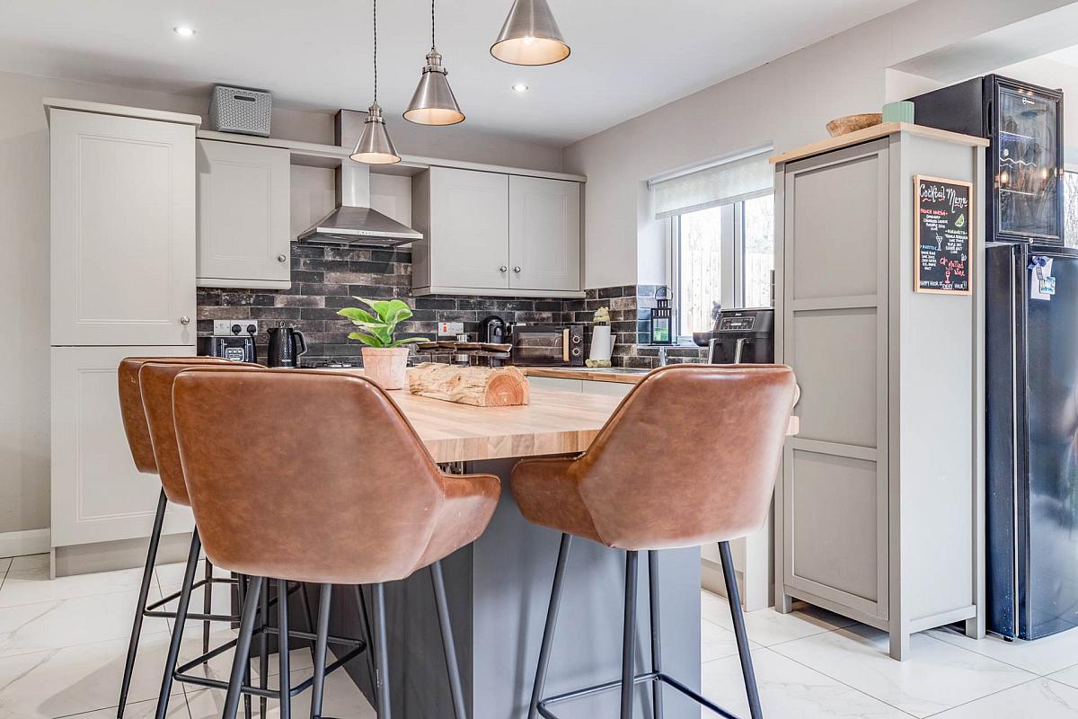 Luxury range of high and low level units with contrasting work surfaces. 1 1/2 bowl sink unit with mixer tap. Built in hob with matching underbench oven and overhead stainless steel extractor canopy. Integrated dishwasher. Integrated Fridge/Freezer. Feature centre island unit. Complimentary wall tiling. Ceramic tiled flooring.