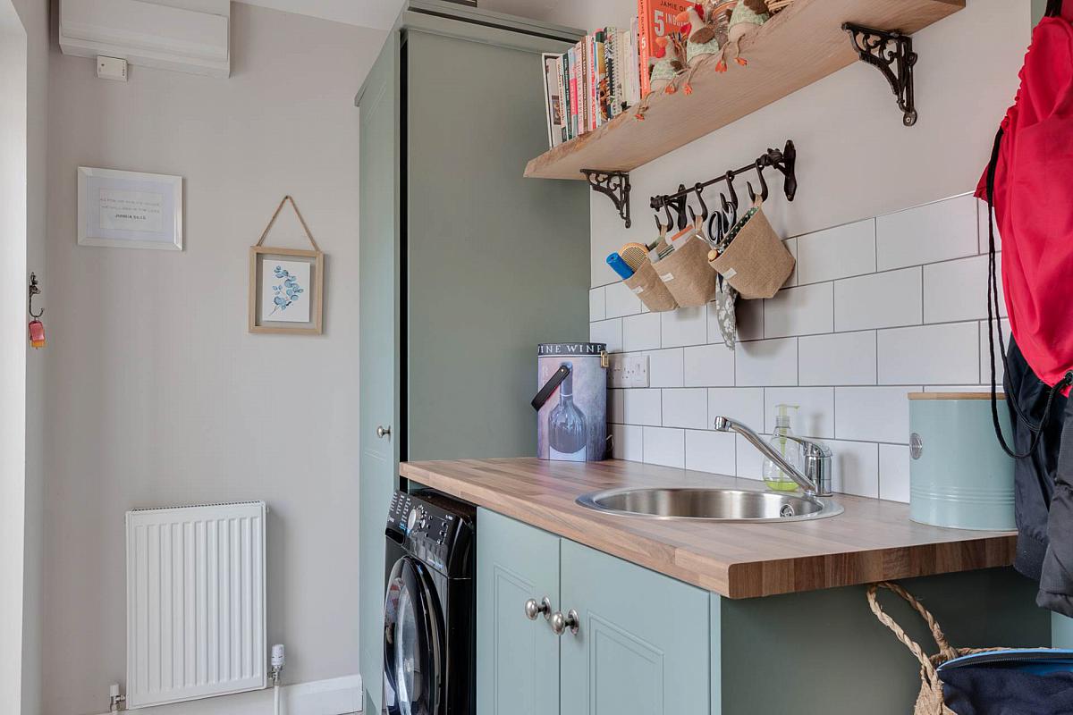 Stainless steel circular sink with mixer tap. Built in larder storage. Low level units with contrasting work surface. Plumbed for automatic washing machine. Complimentary wall tiling and ceramic tiled flooring.
