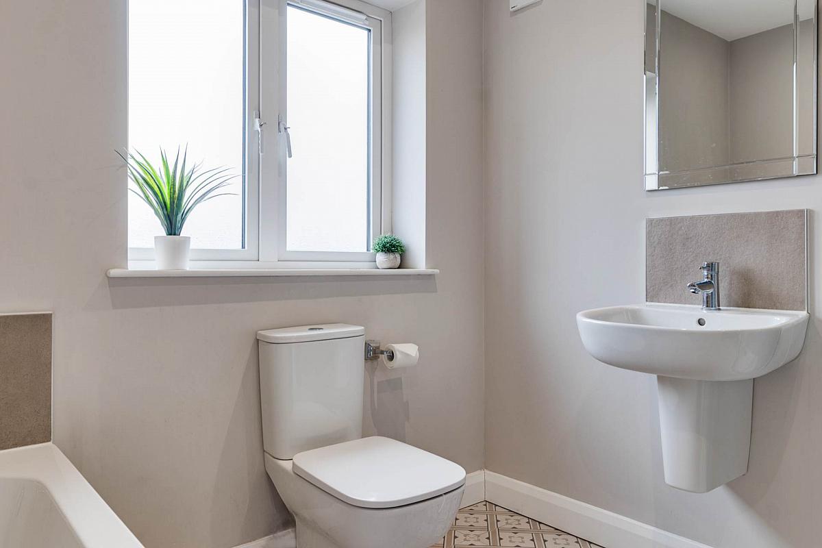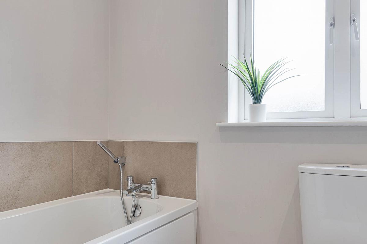 Lavish white suite comprising panelled bath, half pedestal wash hand basin and low flush wc. Complimentary tiled splashbacks and ceramic tiled flooring.