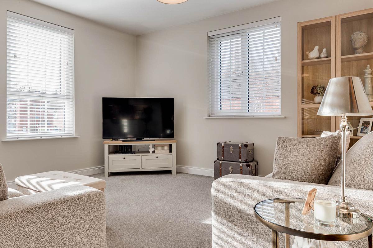 Parking bay to side with communal gardens laid out in lawn.