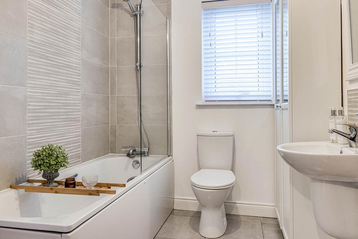 Lavish white suite comprising panelled bath with overhead wall mounted shower attachment and side screen door. Half pedestal wash hand basin and push button wc. Complimentary wall tiling and ceramic tiled flooring.
