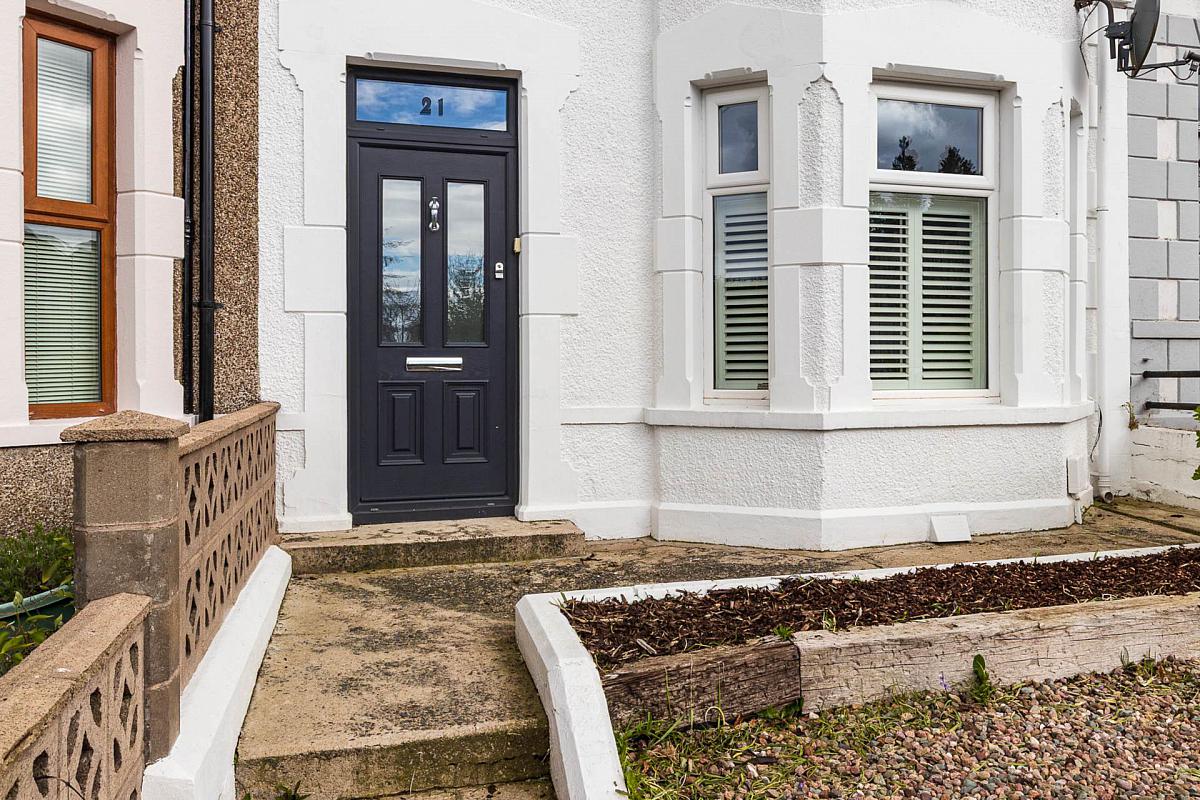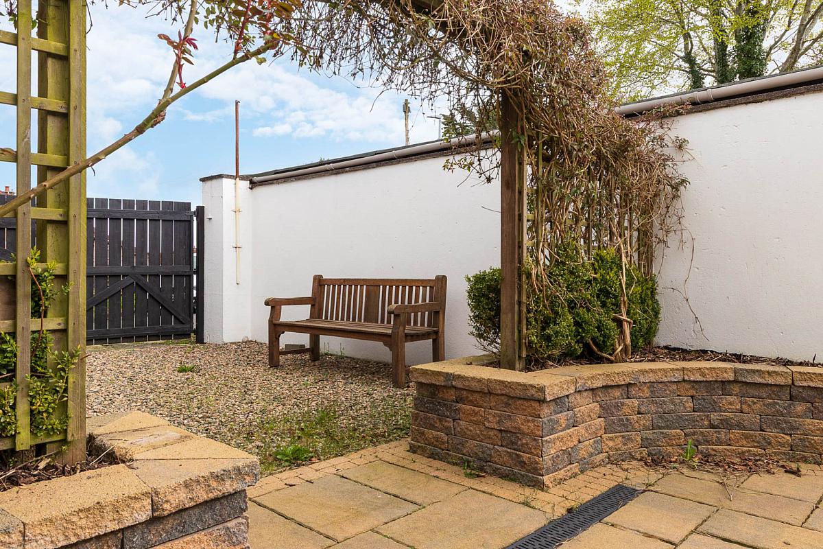 Small enclosed garden to front in decorative stone. Rear walled courtyard style garden with attractive paved patio, barbeque area and variety of raised shrub beds and plants, leading to parking area and accessed via gate from Bellevue Place.