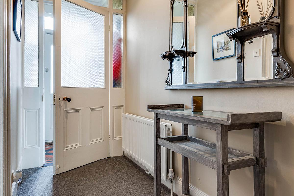 Original tiled flooring. Hardwood door with glass insert and side panels to:-
