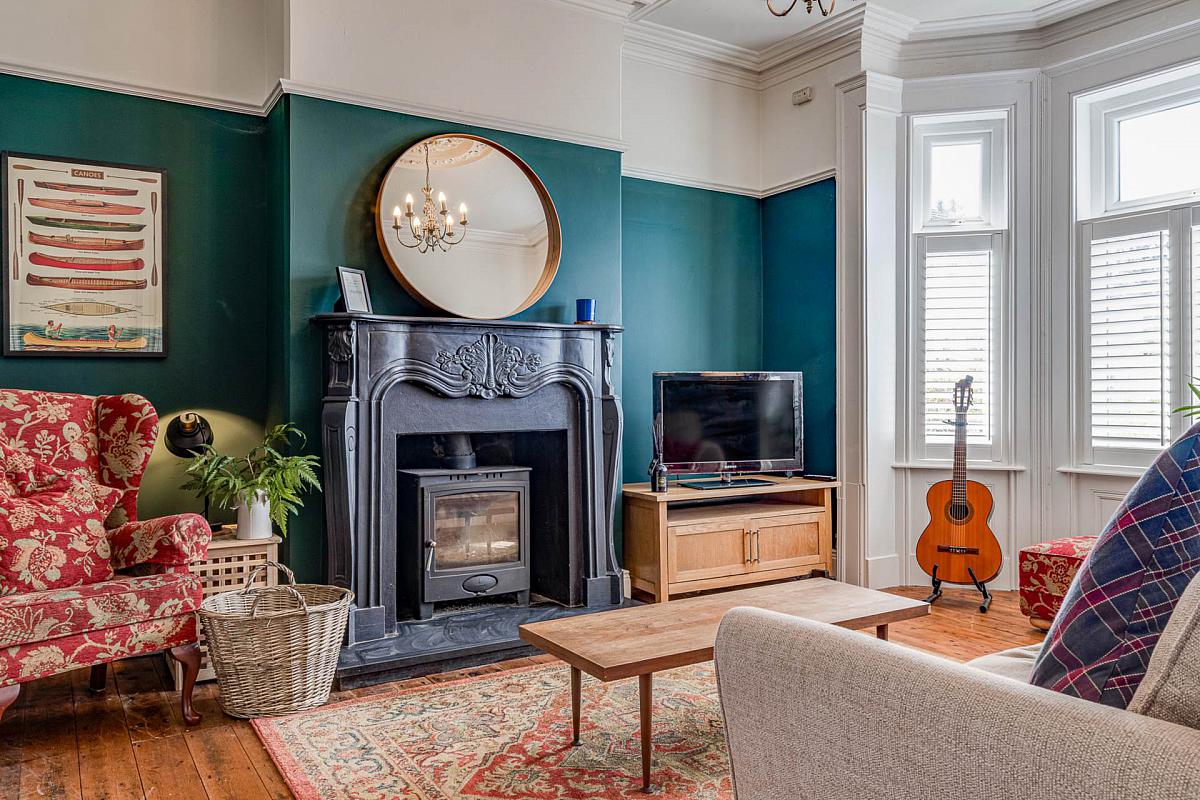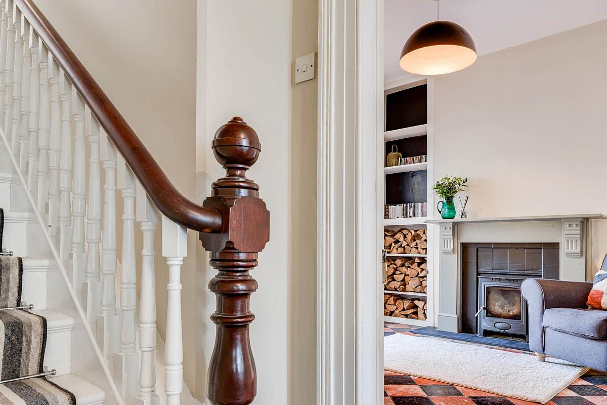 Hardwood flooring. Attractive fireplace housing feature cast iron log burner. Traditional style ceiling cornice and picture rail. Bay window.